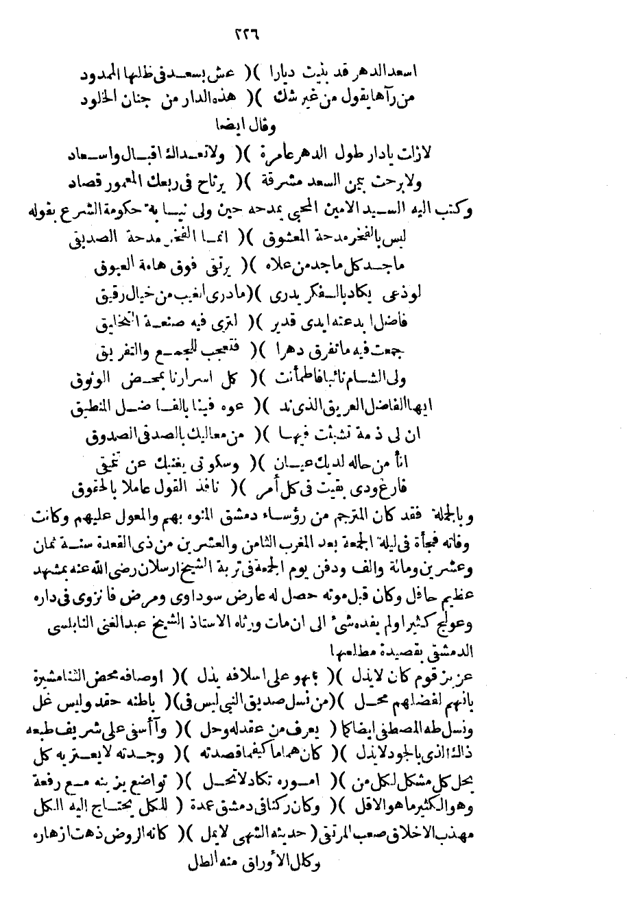 وبالجملة فقد كان المترجم من رؤساء دمشق المنوه بهم والمعول عليهم وكأنت وفاته فجأة في ليلة الجمعة بعد المغرب الثامن والعشرين من ذي القعدة سنة ثمان وعشرين ومائة وألف ودفن يوم الجمعة في تربة الشيخ أرسلان رضي الله عنه بمشهد عظيم حافل وكان قبل موته حصل له عارض سودأوي ومرض فانزوى في داره وعولج كثيراً ولم يفده شيء إلى أن مات ورثاه الاستاذ الشيخ عبد الغني النابلسي الدمشقي بقصيدة مطلعها