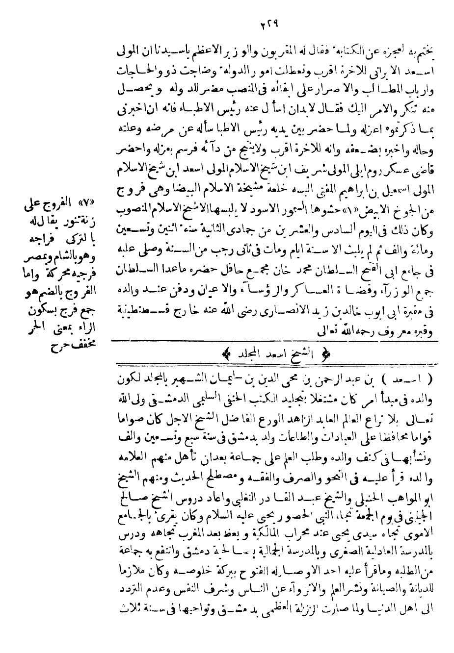 أسعد بن عبد الرحمن بن محي الدين بن سليمان الشهير بالمجلد لكون والده في مبدأ أمر كان مشتغلاً بتجليد الكتب الحنفي السليمي الدمشقي ولي الله تعالى بلا تراع العالم العابد الزاهد الورع الفاضل الشيخ الأجل كان صواماً قواماً محافظاً على العبادات والطاعات ولد بدمشق في سنة سبع وتسعين وألف ونشأ بها في كنف والده وطلب العلم على جماعة بعد أن تأهل منهم العلامة والده قرأ عليه في النحو والصرف والفقه ومصطلح الحديث ومنهم الشيخ أبو المواهب الحنبلي والشيخ عبد القادر التغلبي وأعاد دروس الشيخ صالح الجنيني في يوم الجمعة تجاه النبي الحضور يحيى عليه السلام وكان يقرئ بالجامع الأموي تجاه سيدي يحيى عند محراب المالكية ويعظ بعد المغرب تجاهه ودرس بالمدرسة العادلية الصغرى وبالمدرسة الجمالية بصالحية دمشق وأنتفع به جماعة من الطلبة وما قرأ عليه أحد الا وصار له الفتوح ببركة خلوصه وكان ملازماً للديانة والصيانة ونشر العلم والانزواء عن الناس وشرف النفس وعدم التردد إلى أهل الدنيا ولما صارت الزنزانة العظمى بدمشق ونواحيها في سنة ثلاث