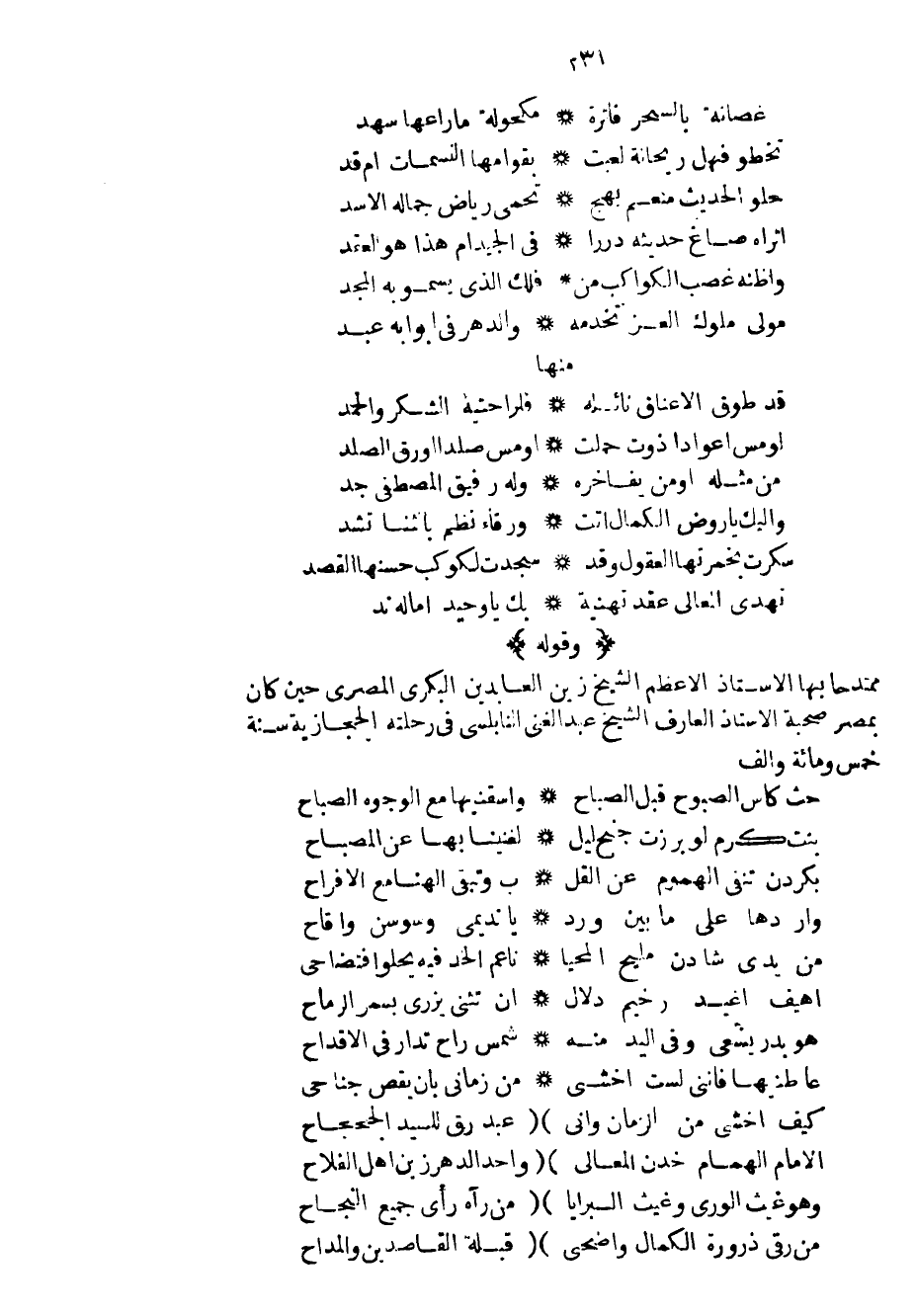 وقوله ممتدحاً بها الاستاذ الأعظم الشيخ زين العابدين البكري المصري حين كان بمصر صحبة الاستاذ العارف الشيخ عبد الغني النابلسي في رحلته الحجازية سنة خمس ومائة وألف