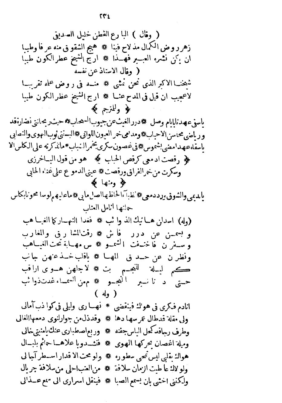 ومنها يا نديمي والشوق ورد دمعي لظباء ألحاظها أصل ما بي ما عليهم لو سامحونا بكاس حملتها أنامل العناب