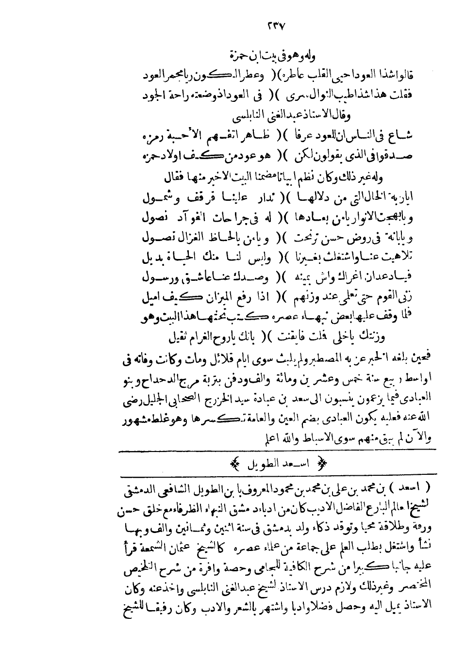 أسعد بن محمد بن علي بن محمد بن محمود المعروف بابن الطويل الشافعي الدمشقي لشيخ لعالم البارع الفاضل الأديب كان من ادباء دمشق النبهاء الظرفاء مع خلق حسن ورقة وطلاقة محيا وتوقد ذكاء ولد بدمشق في سنة اثنين وثمانين وألف وبها نشأ واشتغل بطلب العلم على جماعة من علماء عصره كالشيخ عثمان الشمعة قرأ عليه جانباً كبيراً من شرح الكافية للجامي وحصة وافرة من شرح التلخيص المختصر وغير ذلك ولازم درس الاستاذ لشيخ عبد الغني النابلسي وأخذ عنه وكان الاستاذ يميل إليه وحصل فضلاً وأدباً واشتهر بالشعر والأدب وكان رفيقاً للشيخ