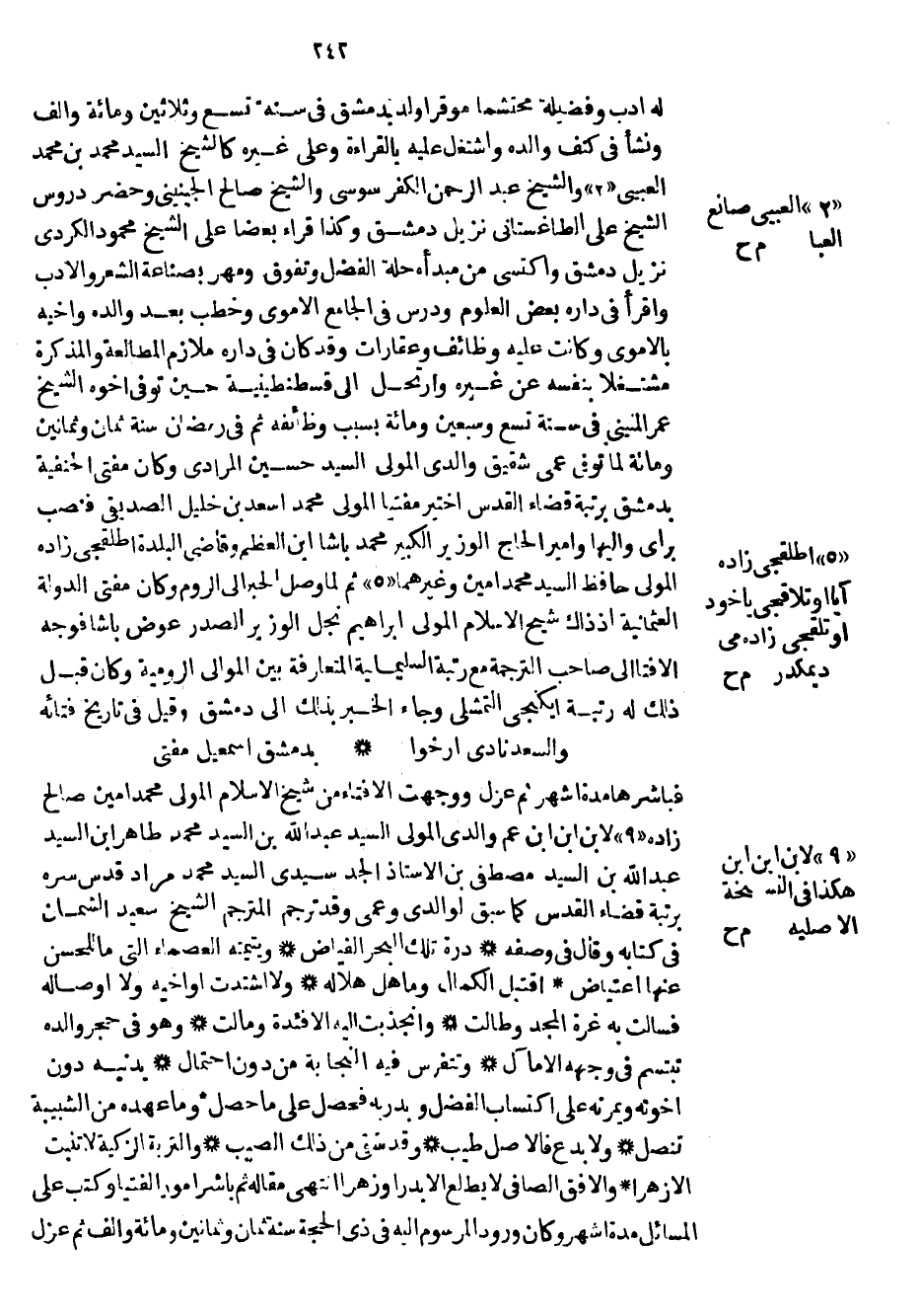 ً له أدب وفضيلة محتشماً موقراً ولد بدمشق في سنة تسع وثلاثين ومائة وألف ونشأ في كنف والده واشتغل عليه بالقراءة وعلى غيره كالشيخ السيد محمد بن محمد العبيبي والشيخ عبد الرحمن الكفرسوسي والشيخ صالح الجنيني وحضر دروس الشيخ علي الطاغستاني نزيل دمشق وكذا قراء بعضاً على الشيخ محمود الكردي نزيل دمشق واكتسى من مبدأه حلة الفضل وتفوق ومهر بصناعة الشعر والأدب واقرأ في داره بعض العلوم ودرس في الجامع الأموي وخطب بعد والده وأخيه بالأموي وكأنت عليه وظائف وعقارات وقد كان في داره ملازم المطالعة والمذكرة مشتغلاً بنفسه عن غيره وارتحل إلى قسطنطينية حين توفي أخوه الشيخ عمر المنيني في سنة تسع وسبعين ومائة بسبب وظائفه ثم في رمضان سنة ثمان وثمانين ومائة لما توفي عمي شقيق والدي المولى السيد حسين المرادي وكان مفتي الحنفية بدمشق برتبة قضاء القدس اختير مفتياً المولى محمد أسعد بن خليل الصديقي فنصب برأي واليها وأمير الحاج الوزير الكبير محمد باشا ابن العظيم وقاضي البلدة اطلقجي زاده المولى حافظ السيد محمد أمين وغيرهما ثم لما وصل إلى الحبر إلى الروم وكان مفتي الدولة العثمانية اذ ذاك شيخ الاسلام المولى إبراهيم نجل الوزير الصدر عوض باشا فوجه الافتا إلى صاحب الترجمة مع رتبة السليمانية المتعارفة بين الموالي الرومية وكان قبل ذلك له رتبة ايكنجي التمشلي وجاء الخبر بذلك إلى دمشق وقيل في تاريخ فتائه