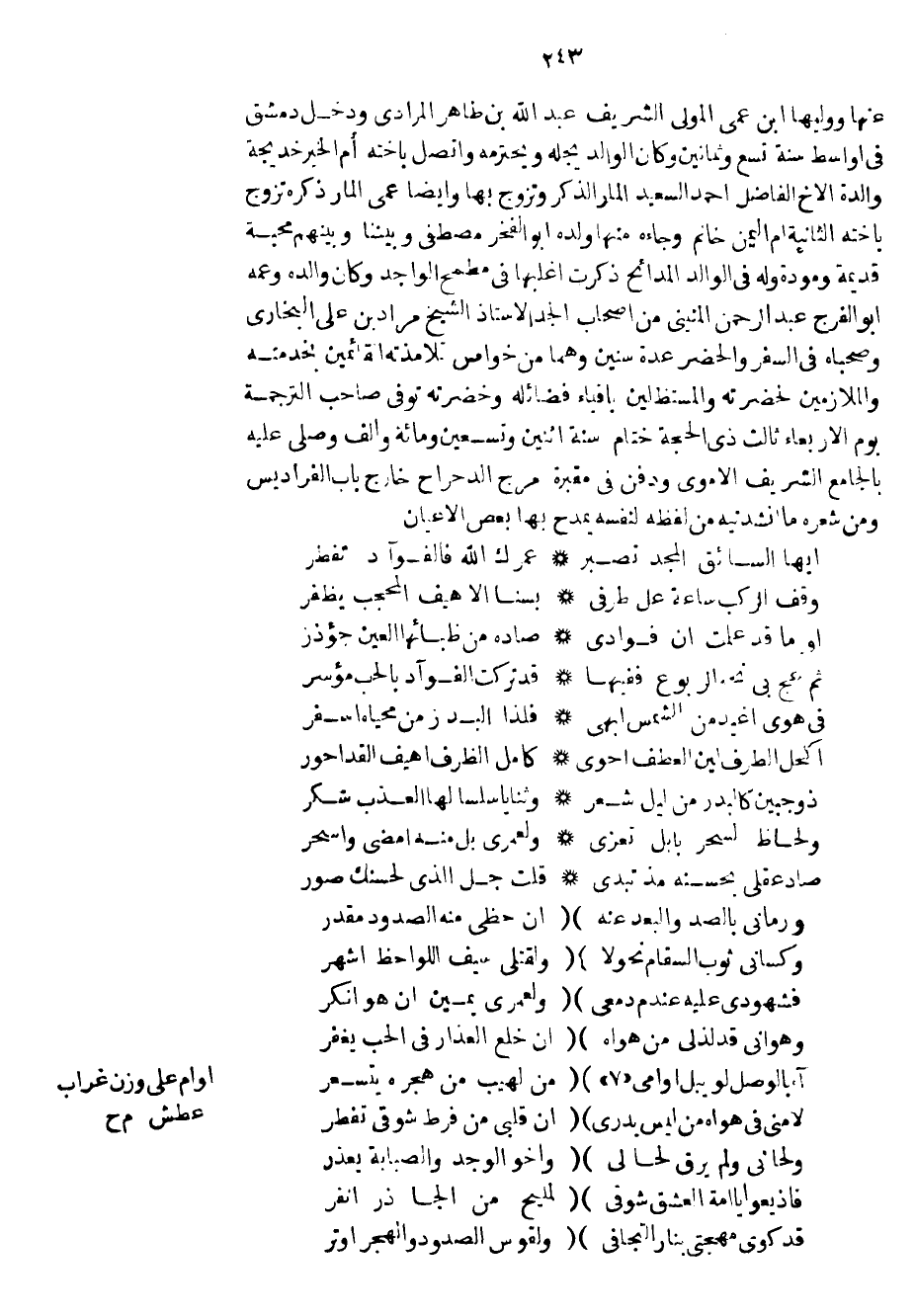 عنها ووليها ابن عمي المولى الشريف عبد الله بن طاهر المرادي ودخل دمشق في أواسط سنة تسع وثمانين وكان الوالد يجله ويحترمه واتصل بأخته أم الخير خديجة والدة الأخ الفاضل أحمد السعيد المار الذكر وتزوج بها وأيضاً عمي المار ذكره تزوج بأخته الثانية ام اليمن خانم وجاءه منها ولده أبو الفخر مصطفى وبيننا وبينهم محبة قديمة ومودة وله في الوالد المدائح ذكرت أغلبها في مطمح الواجد وكان والده وعمه أبو الفرج عبد الرحمن المنيني من أصحاب الجد الاستاذ الشيخ مراد بن علي البخاري وصحباه في السفر والحضر عدة سنين وهما من خواص تلامذته القائمين بخدمته والملازمين لحضرته والمستظلين باقياء فضائله وخضرته توفي صاحب الترجمة يوم الأربعاء ثالث ذي الحجة ختام سنة اثنين وتسعين ومائة وألف وصلى عليه بالجامع الشريف الأموي ودفن في مقبرة مرج الدحراح خارج باب الفراديس ومن شعره ما أنشدنيه من لفظه لنفسه يمدح بها بعض الأعيان