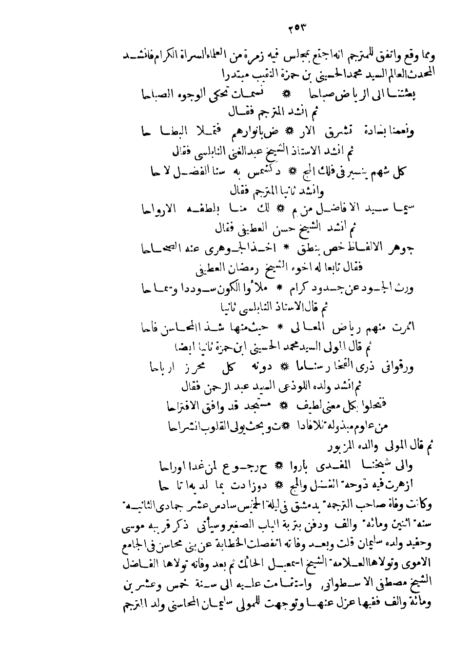 ومما وقع واتفق للمترجم انه اجتمع بمجلس فيه زمرة من العلماء السراة الكرام فأنشد المحدث العالم السيد محمد الحسيني بن حمزة النقيب مبتدراً