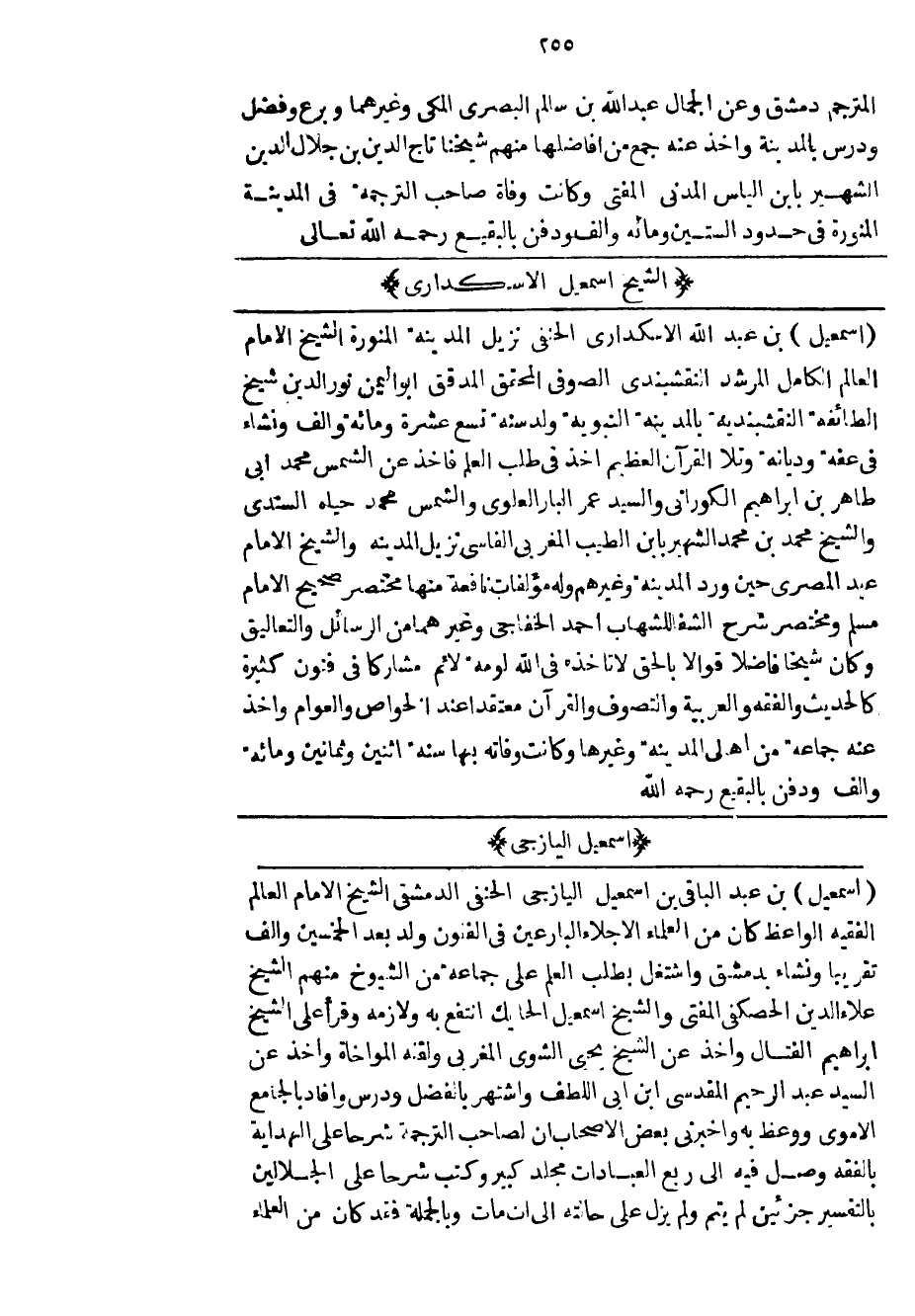 إسماعيل بن عبد الله الاسكداري الحنفي نزيل المدينة المنورة الشيخ الامام العالم الكامل المرشد النقشبندي الصوفي المحقق المدقق أبو اليمن نور الدين شيخ الطائفة النقشبندية بالمدينة النبوية ولد سنة تسع عشرة ومائة وألف ونشاء في عفة وديانة وتلا القرآن العظيم أخذ في طلب العلم فأخذ عن الشمس محمد أبي طاهر بن إبراهيم الكوراني والسيد عمر البار العلوي والشمس محمد حياه السندي والشيخ محمد بن محمد الشهير بابن الطيب المغربي الفاسي نزيل المدينة والشيخ الامام عبد المصري حين ورد المدينة وغيرهم وله مؤلفات نافعة منها مختصر صحيح الامام مسلم ومختصر شرح الشفا للشهاب أحمد الخفاجي وغيرهما من الرسائل والتعاليق وكان شيخاً فاضلاً قوالاً بالحق لا تأخذه في الله لومة لائم مشاركاً في فنون كثيرة كالحديث والفقه والعربية والتصوف والقرآن معتقداً عند الخواص والعوام وأخذ عنه جماعة من أهلي المدينة وغيرها وكأنت وفاته بها سنة اثنين وثمانين ومائة وألف ودفن بالبقيع رحمه الله.