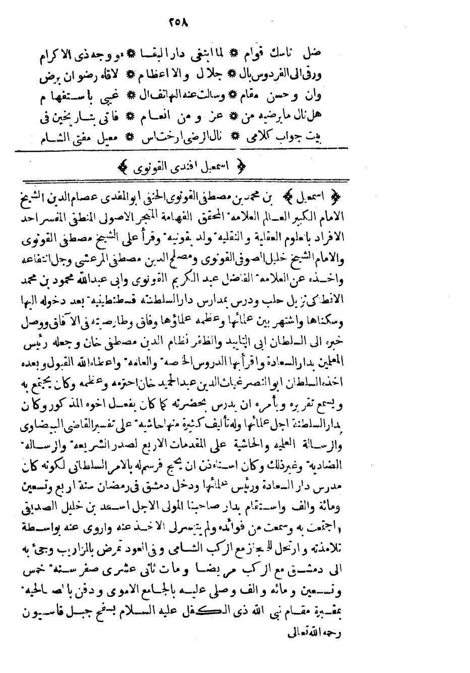إسماعيل بن محمد بن مصطفى القونوي الحنفي أبو المفدي عصام الدين الشيخ الامام الكبير العالم العلامة المحقق الفهامة المتجر الاصولي المنطقي المفسر أحد الأفراد بالعلوم العقلية والنقلية ولد بقونية وقرأ على الشيخ مصطفى القونوي والامام الشيخ خليل الصوفي القونوي ومصلح الدين مصطفى المرعشي وجل أنتفاعه وأخذه عن العلامة الفاضل عبد الكريم القونوي وأبي عبد الله محمود بن محمد الأنطاكي نزيل حلب ودرس بمدارس داراً لسلطنته قسطنطينية بعد دخوله اليها وسكناها واشتهر بين علمائها وعظمه علماؤها وفاق وطار صيته في الآفاق ووصل خبره إلى السلطان أبي التأييد والظفر نظام الدين مصطفى خان وجعله رئيس المعلمين بدار السعادة واقرأ بها الدروس الخاصة والعامة وأعطاه الله القبول وبعده أخذه السلطان أبو النصر غياث الدين عبد الحميد خان احترمه وعظمه وكان يجتمع به ويسمع تقريره ويأمره أن يدرس بحضرته كما كان يفعل أخوه المذكور وكان بدار السلطنة أجل علمائها وله تأليف كثيرة منها حاشية على تفسير القاضي البيضأوي والرسالة العلمية والحاشية على المقدمات الأربع لصدر الشريعة والرسالة الضادية وغير ذلك وكان استأذن أن يحج فرسم له بالأمر السلطاني لكونه كان مدرس دار السعادة ورئيس علمائها ودخل دمشق في رمضان سنة أربع وتسعين ومائة وألف واستقام بدار صاحبنا المولى الأجل أسعد بن خليل الصديقي واجتمعت به وسمعت من فوائده ولم يتيسر لي الأخذ عنه وأروي عنه بواسطة تلامذته وارتحل للحجاز مع الركب الشامي وفي العود تمرض بالمزاريب وجئ به إلى دمشق مع الركب مريضاً ومات ثاني عشري صفر سنة خمس وتسعين ومائة وألف وصلى عليه بالجامع الأموي ودفن بالصالحية بمقبرة مقام نبي الله ذي الكفل عليه السلام بسفح جبل قاسيون رحمه الله تعالى.