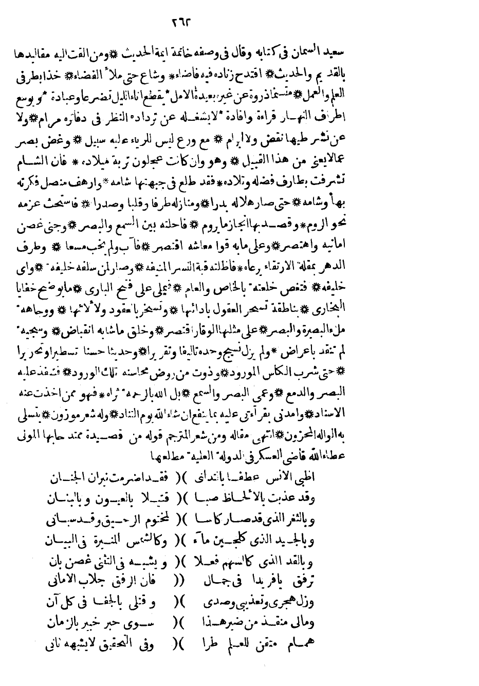 سعيد السمان في كتابه وقال في وصفه خاتمة أيمة الحديث ومن ألقت إليه مقاليدها بالقديم والحديث اقتدح زناده فيه فأضاء وشاع حتى ملأ الفضاء خذا بطرفي العلم والعمل متسنماً ذروة عن غيره بعيده الأمل يقطع اناء الليل تضرعاً وعبادة ويوسع أطراف النهار قراءة وافادة لا يشغله عن ترداده النظر في دفاتره مرام ولا عن نشر طيها نقض ولا ابرام مع ورع ليس للرياء عليه سبيل وغض بصر عما لا يعني من هذا القبيل وهو وان كأنت عجلون تربة ميلاده فان الشام تشرفت بطارف فضله وتلاده فقد طلع في جبهتها شامه وأرهف منصل فكرته بها وشامه حتى صار هلاله بدراً ومنازله طرفاً وقلباً وصدراً فاستحث عزمه نحو الروم وقصد بها انجاز ما يروم فأحلته بين السمع والبصر وجنى غصن أمانيه واهتصر وعلى ما به قوا معاشه اقتصر فآب ولم يخب مسعا وطرف الدهر بمقلة الارتقاء يرعاه فأظلته قبة النسر المنيفة وصار لمن سلفه خليفة وأي خليفة فتغص خلعته بالخاص والعام فيملي على فتح الباري ما يوضح خفايا البخاري بناطقة تسحر العقول بادائها وتسخر بالعقود ولألائها ووجاهة ملء البصيرة والبصر على مثلها الوقار اقتصر وخلق ما شابه انقباض وسجية لم تنقد باعراض ولم يزل نسيج وحدة تأليفاً وتقريراً وحديثاً حسناً تسطيراً وتحريراً حتى شرب الكاس المورود وذوت من روض محاسنه تلك الورود فتنفذ عليه البصر والدمع وعمي البصر والسمع بل الله بالرحمة ثراه فهو ممن أخذت عنه الاسناد وأمدني بقراءتي عليه بما ينفع ان شاء الله يوم التناد وله شعر موزون يتسلى به الواله المحزون أنتهى مقاله ومن شعر المترجم قوله من قصيدة ممتدحاً بها المولى عطاء الله قاضي العسكر في الدولة العلية مطلعها