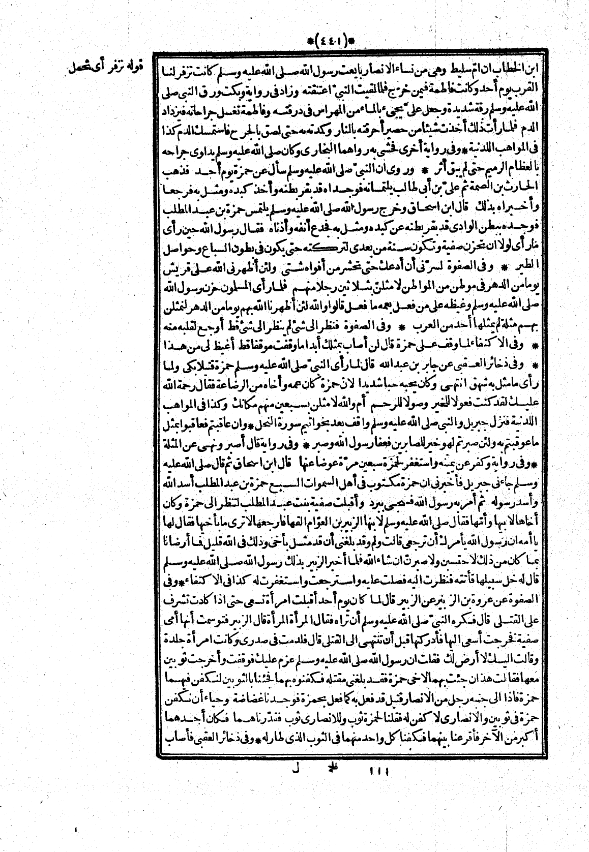 ابن الخطاب ان امّ سليط وهى من نساء الانصار بايعت رسول الله صلّى الله عليه وسلم كانت تزفر لنا القرب يوم أحد وكانت فاطمة فيمن خرج فلما لقيت النبىّ اعتنقته وزاد فى رواية وبكت ورق النبى صلّى الله عليه وسلم رقة شديدة وجعل علىّ يجىء بالماء من المهراس فى درقته وفاطمة تغسل جراحاته فيزداد الدم فلما رأت ذلك أخذت شيئا من حصير أحرقته بالنار وكمدته به حتى لصق بالجرح فاستمسك الدم كذا فى المواهب اللدنية* وفى رواية أخرى فحشى به رواهما البخارى وكان صلّى الله عليه وسلم يداوى جراحه بالعظام الرميم حتى لم يبق أثر* وروى ان النبىّ صلّى الله عليه وسلم سأل عن حمزة يوم أحد فذهب الحارث بن الضمة ثم علىّ بن أبى طالب يلتمسانه فوجداه قد بقر بطنه وأخذ كبده ومثل به فرجعا وأخبراه بذلك قال ابن اسحاق وخرج رسول الله صلّى الله عليه وسلم يلتمس حمزة بن عبد المطلب فوجده ببطن الوادى قد بقر بطنه عن كبده ومثل به فجدع أنفه وأذناه فقال رسول الله حين رأى ما رأى لولا ان تحزن صفية وتكون سنة من بعدى لتركته حتى يكون فى بطون السباع وحواصل الطير* وفى الصفوة لسرّنى أن أدعك حتى تحشر من أفواه شتى ولئن أظهرنى الله على قريش يوما من الدهر فى موطن من المواطن لا مثلنّ بثلاثين رجلا منهم فلما رأى المسلمون حزن رسول الله صلى الله عليه وسلم وغيظه على من فعل بعمه ما فعل قالوا والله لئن أظهرنا الله بهم يوما من الدهر لنمثلن بهم مثلة لم يمثلها أحد من العرب* وفى الصفوة فنظر الى شىء لم ينظر الى شىء قط أوجع لقلبه منه* وفى الاكتفاء لما وقف على حمزة قال لن أصاب بمثلك أبدا ما وقفت موقفا قط أغيظ لى من هذا* وفى ذخائر العقبى عن جابر بن عبد الله قال لما رأى النبىّ صلّى الله عليه وسلم حمزة قتيلا بكى ولما رأى ما مثل به شهق انتهى وكان يحبه حبا شديدا لانّ حمزة كان عمه وأخاه من الرضاعة فقال رحمة الله عليك لقد كنت فعولا للخير وصولا للرحم أم والله لامثلن بسبعين منهم مكانك وكذا فى المواهب اللدنية فنزل جبريل والنبى صلّى الله عليه وسلم واقف بعد بخواتيم سورة النحل* وان عاقبتم فعاقبوا بمثل ما عوقبتم به ولئن صبرتم لهو خير للصابرين فعفا رسول الله وصبر* وفى رواية قال أصبر ونهى عن المثلة* وفى رواية وكفر عن يمينه واستغفر لحمزة سبعين مرّة عوضا عنها قال ابن اسحاق ثم قال صلّى الله عليه وسلم جاءنى جبريل فأخبرنى ان حمزة مكتوب فى أهل السموات السبع حمزة بن عبد المطلب أسد الله وأسد رسوله ثم أمر به رسول الله فسجى ببرد وأقبلت صفية بنت عبد المطلب لتنظر الى حمزة وكان أخاها لابيها وأمّها فقال صلّى الله عليه وسلم لابنها الزبير بن العوّام القها فارجعها لا ترى ما بأخيها فقال لها يا أمه ان رسول الله يأمرك أن ترجعى قالت ولم وقد بلغنى أن قد مثل بأخى وذلك فى الله قليل فما أرضانا بما كان من ذلك لاحتسبن ولا صبرنّ ان شاء الله فلما أخبر الزبير بذلك رسول الله صلّى الله عليه وسلم قال له خل سبيلها قأتته فنظرت اليه فصلت عليه واسترجعت واستغفرت له كذا فى الاكتفاء* وفى الصفوة عن عروة بن الزبير عن الزبير قال لما كان يوم أحد أقبلت امرأة تسعى حتى اذا كادت تشرف على القتلى قال فكره النبىّ صلّى الله عليه وسلم أن تراه فقال المرأة المرأة قال الزبير فتوسمت أنها أمى صفية فخرجت أسعى اليها فأدركتها قبل أن تنتهى الى القتلى قال فلدمت فى صدرى وكانت امرأة جلدة وقالت اليك لا أرض لك فقلت ان رسول الله صلّى الله عليه وسلم عزم عليك فوقفت وأخرجت ثوبين معها فقالت هذان جئت بهما لاخى حمزة فقد بلغنى مقتله فكفنوه بهما فجئنا بالثوبين لنكفن فيهما حمزة فاذا الى جنبه رجل من الانصار قتيل قد فعل به كما فعل بحمزة فوجدنا غضاضة وحياء أن نكفن حمزة فى ثوبين والانصارى لا كفن له فقلنا لحمزة ثوب وللانصارى ثوب فقدّرناهما فكان أحدهما أكبر من الآخر فأقر عنا بينهما فكفنا كل واحد منهما فى