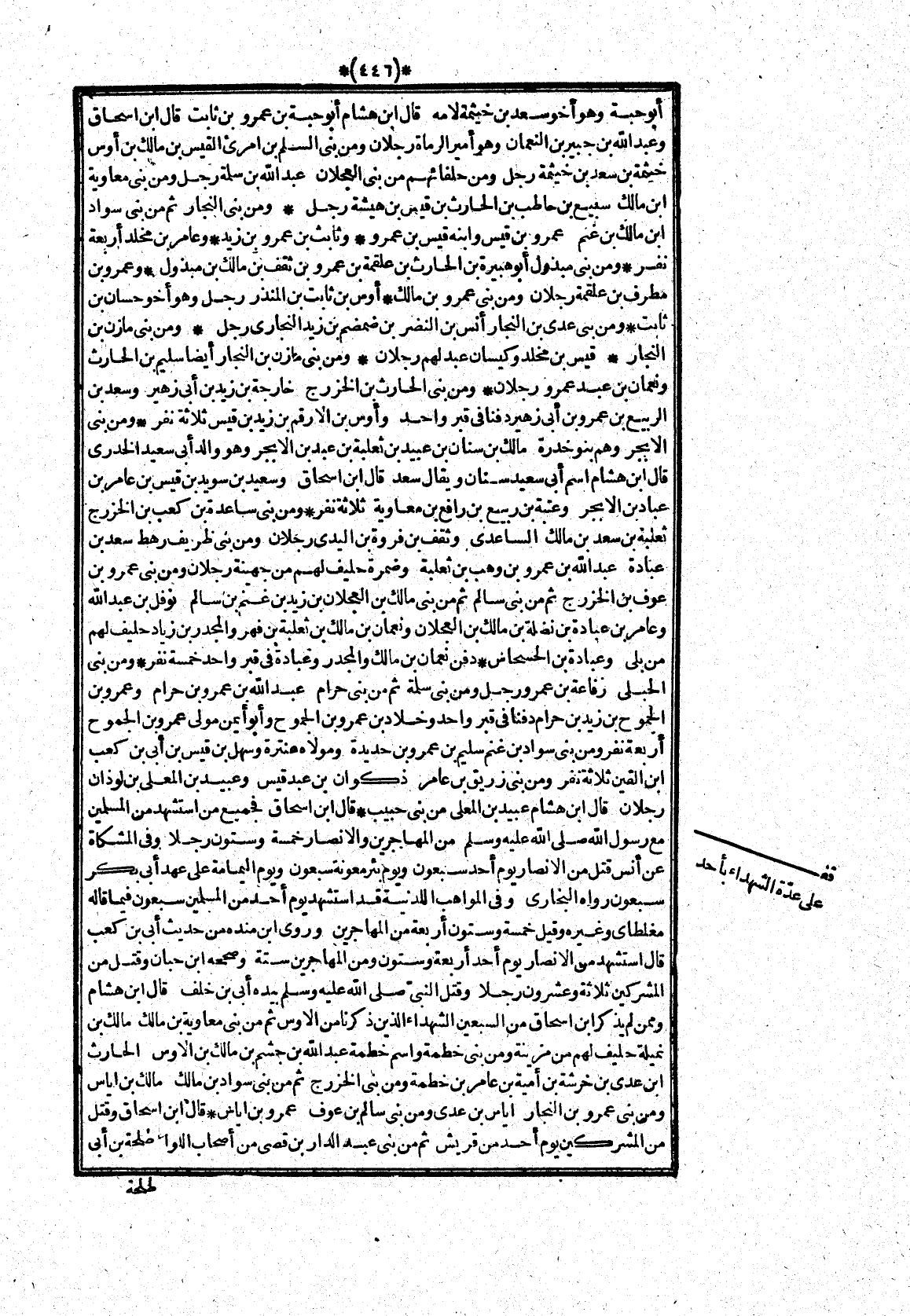 أبو حبة وهو أخو سعد بن خيثمة لامه قال ابن هشام أبو حبة بن عمرو بن ثابت قال ابن اسحاق وعبد الله بن جبير بن النعمان وهو أمير الرماة رجلان ومن بنى السلم بن امرئ القيس بن مالك بن أوس خيثمة بن سعد بن خيثمة رجل ومن حلفائهم من بنى العجلان عبد الله بن سلمة رجل ومن بنى معاوية ابن مالك سبيع بن حاطب بن الحارث بن قيس بن هيشة رجل* ومن بنى النجار ثم من بنى سواد ابن مالك بن غنم عمرو بن قيس وابنه قيس بن عمرو* وثابت بن عمرو بن زيد* وعامر بن مخلد أربعة نفر* ومن بنى مبذول أبو هبيرة بن الحارث بن علقمة بن عمرو بن ثقف بن مالك بن مبذول* وعمرو بن مطرف بن علقمة رجلان ومن بنى عمرو بن مالك* أوس بن ثابت بن المنذر رجل وهو أخو حسان بن ثابت* ومن بنى عدى بن النجار أنس بن النضر بن ضمضم بن زيد النجارى رجل* ومن بنى مازن بن النجار* قيس بن مخلد وكيسان عبد لهم رجلان* ومن بنى مازن بن النجار أيضا سليم بن الحارث ونعمان بن عبد عمرو رجلان* ومن بنى الحارث بن الخزرج خارجة بن زيد بن أبى زهير وسعد بن الربيع بن عمرو بن أبى زهير دفنا فى قبر واحد وأوس بن الارقم بن زيد بن قيس ثلاثة نفر* ومن بنى الابجر وهم بنو خدرة مالك بن سنان بن عبيد بن ثعلبة بن عبد بن الابجر وهو والد أبى سعيد الخدرى قال ابن هشام اسم أبى سعيد سنان ويقال سعد قال ابن اسحاق وسعيد بن سويد بن قيس بن عامر بن عباد بن الابجر وعتبة بن ربيع بن رافع بن معاوية ثلاثة نفر* ومن بنى ساعدة بن كعب بن الخزرج ثعلبة بن سعد بن مالك الساعدى وثقف بن فروة بن اليدى رجلان ومن بنى ظريف رهط سعد بن عبادة عبد الله بن عمرو بن وهب بن ثعلبة وضمرة حليف لهم من جهينة رجلان ومن بنى عمرو بن عوف بن الخزرج ثم من بنى سالم ثم من بنى مالك بن العجلان بن زيد بن غنم بن سالم نوفل بن عبد الله وعامر بن عبادة بن نضلة بن مالك بن العجلان ونعمان بن مالك بن ثعلبة بن فهر والمجدر بن زياد حليف لهم من بلى وعبادة بن الحسحاس* دفن نعان بن مالك والمجدر وعبادة فى قبر واحد خمسة نفر* ومن بنى الحبلى زفاعة بن عمرو رجل ومن بنى سلمة ثم من بنى حرام عبد الله بن عمرو بن حرام وعمرو بن الجموح بن زيد بن حرام دفنا فى قبر واحد وخلاد بن عمرو بن الجموح وأبو أيمن مولى عمرو بن الجموح أربعة نفر ومن بنى سواد بن غنم سليم بن عمرو بن حديدة ومولاه عنترة وسهل بن قيس بن أبى بن كعب ابن القين ثلاثة نفر ومن بنى زريق بن عامر ذكوان بن عبد قيس وعبيد بن المعلى بن لوذان رجلان قال ابن هشام عبيد بن المعلى من بنى حبيب*