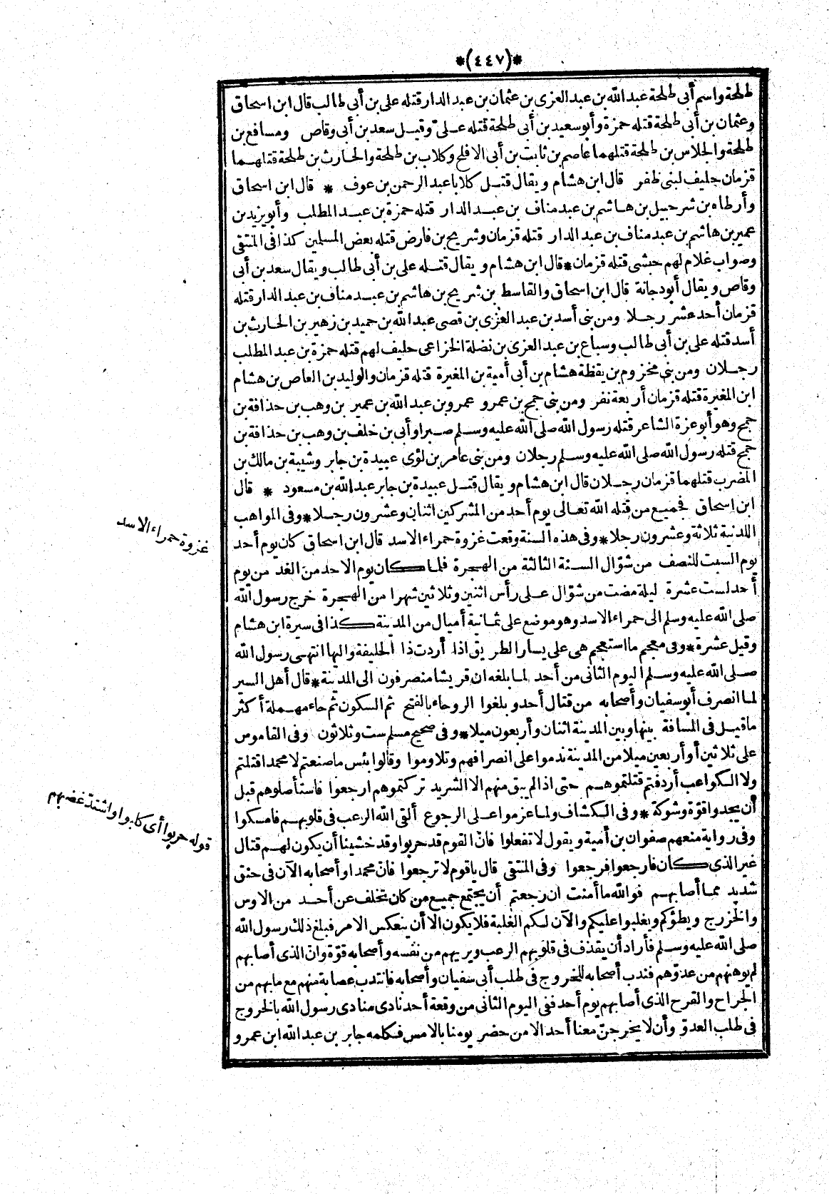 طلحة واسم أبى طلحة عبد الله بن عبد العزى بن عثمان بن عبد الدار قتله على بن أبى طالب قال ابن اسحاق وعثمان بن أبى طلحة قتله حمزة وأبو سعيد بن أبى طلحة قتله علىّ وقيل سعد بن أبى وقاص ومسافع بن طلحة والجلاس بن طلحة قتلهما عاصم بن ثابت بن أبى الافلح وكلاب بن طلحة والحارث بن طلحة قتلهما قزمان حليف لبنى ظفر قال ابن هشام ويقال قتل كلابا عبد الرحمن بن عوف* قال ابن اسحاق وأرطاه بن شرحبيل بن هاشم بن عبد مناف بن عبد الدار قتله حمزة بن عبد المطلب وأبو يزيد بن عمير بن هاشم بن عبد مناف بن عبد الدار قتله قزمان وشريح بن فارض قتله بعض المسلمين كذا فى المنتقى وصواب غلام لهم حبشى قتله قزمان* قال ابن هشام ويقال قتله على بن أبى طالب ويقال سعد بن أبى وقاص ويقال أبو دجانة قال ابن اسحاق والقاسط بن شريح بن هاشم بن عبد مناف بن عبد الدار قتله قزمان أحد عشر رجلا ومن بنى أسد بن عبد العزى بن قصى عبد الله بن حميد بن زهير بن الحارث بن أسد قتله على بن أبى طالب وسباع بن عبد العزى بن نضلة الخزاعى حليف لهم قتله حمزة بن عبد المطلب رجلان ومن بنى مخزوم بن يقظة هشام بن أبى أمية بن المغيرة قتله قزمان والوليد بن العاص بن هشام ابن المغيرة قتله قزمان أربعة نفر ومن بنى جمح بن عمرو عمرو بن عبد الله بن عمير بن وهب بن حذافة بن جمح وهو أبو عزة الشاعر قتله رسول الله صلّى الله عليه وسلم صبرا وأبى بن خلف بن وهب بن حذافة بن جمح قتله رسول الله صلّى الله عليه وسلم رجلان ومن بنى عامر بن لؤى عبيدة بن جابر وشيبة بن مالك بن المضرب قتلهما قزمان رجلان قال ابن هشام ويقال قتل عبيدة بن جابر عبد الله بن مسعود* قال ابن اسحاق فجميع من قتله الله تعالى يوم أحد من المشركين اثنان وعشرون رجلا* وفى المواهب اللدنية ثلاثة وعشرون رجلا*