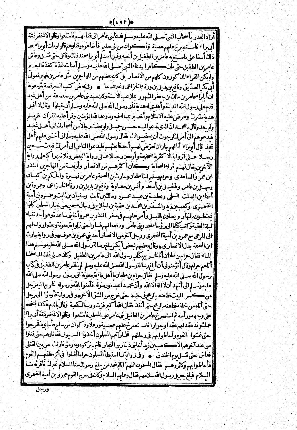 أراد الغدر بأصحاب النبىّ صلّى الله عليه وسلم فدعا بنى عامر الى قتالهم فامتنعوا وقالوا لا نخفر ذمّة أبى براء فاستصرخ عليهم عصية وذكوان من بنى سليم فأطاعوه وقتلوهم قالوا ومات أبو براء بعد ذلك أسفا على ما صنع به عامر بن الطفيل بن أخيه وقيل أسلم أبو براء عند ذلك وقاتل حتى قتل وعاش عامر بن الطفيل حتى مات كافرا بدعاء النبىّ صلّى الله عليه وسلم أصابته غدّة كغدّة البعير ولم يكن القراء المذكورون كلهم من الانصار بل كان بعضهم من المهاجرين مثل عامر بن فهيرة مولى أبى بكر الصدّيق ونافع بن بديل بن ورقاء الخزاعى وغيرهما* وفى بعض كتب السير قصة بئر معونة أن أبا براء عامر بن مالك بن جعفر المشهور بملاعب الا سنة وكان سيد بنى عامر بن صعصعة من أهل نجد قدم على رسول الله المدينة وأهدى له هدية فأبى رسول الله صلّى الله عليه وسلم أن يقبلها وقال لا أقبل هدية مشرك وعرض عليه الاسلام وأخبر بماله فيه وما وعد الله المؤمنين وقرأ عليه القرآن فلم يسلم ولم يبعد وقال يا محمد انّ الذى تدعو اليه حسن جميل ولو بعثت رجالا من أصحابك الى أهل نجد فيدعوهم الى أمرك لرجوت أن يستجيبوا لك فقال رسول الله صلّى الله عليه وسلم انى أخشى عليهم أهل نجد قال أبو براء أنالهم جاران تعرّض لهم أحد فابعثهم فليدعوا الناس الى أمرك فبعث سبعين رجلا على الرواية الاكثرية الصحيحة وأربعين رجلا على رواية البعض وثلاثين راكبا على رواية الآخرين يقال لهم قراء الصحابة وكان أكثرهم من الانصار وأربعة من المهاجرين المنذر ابن عمر والساعدى وحرام وسليم ابنا ملحان وحارث بن الصمة وعامر بن فهيرة والحكم بن كيسان وسهل بن عامر وطفيل بن أسعد وأنس بن معاوية ونافع بن بديل بن ورقاء الخزاعى وعروة بن أسماء بن الصلت السلمى وعطية بن عبد عمرو ومالك بن ثابت وسفيان بن ثابت وعمرو بن أمية الضمرى وكعب بن زيد والمنذر بن محمد بن عقبة بن الجلاح فى رجال مسمين من خيار المسلمين كانوا يحتطبون بالنهار ويصلون بالليل وأمر عليهم فى صفر المنذر بن عمرو أخا بنى ساعدة وهو أحد نقباء ليلة العقبة وكتب كتابا الى رؤساء نجد وبنى عامر ودفعه اليهم فساوا حتى نزلوا بئر معونة وبعثوا رواحلهم الى المرعى مع عمرو بن أمية الضمرى ورجل آخر من الانصار أحد بنى عمرو بن عوف* وفى رواية حارث ابن الصمة بدل الانصارى* وقال بعضهم لبعض أيكم يبلغ رسالة رسول الله صلّى الله عليه وسلم هذا الماء فقال حرام بن ملحان أنا فخرج بكتاب رسول الله الى عامر بن الطفيل وكان على ذلك الماء فلما أتاهم حرام وقال أتؤمنونى أن أبلغ رسالة رسول الله صلّى الله عليه وسلم لم ينظر عامر بن الطفيل فى كتاب رسول الله صلّى الله عليه وسلم فقال حرام بن ملحان يا أهل ماء بئر معونة انى رسول رسول الله صلّى الله عليه وسلم انى أشهد أن لا اله الا الله وأنّ محمدا عبده ورسوله فآمنوا بالله ورسوله فخرج اليه رجل من كسر البيت فطعنه بالرمح فى حنبه حتى خرج من الشق الآخر* وفى رواية فأومؤا الى رجل حتى أتاه من خلفه فطعنه بالرمح حتى أنفذ فقال الله أكبر فزت ورب الكعبة وقال بالدم هكذا فنضحه على وجهه ورأسه ثم استصرخ عامر بن الطفيل بنى عامر على المسلمين فامتنعوا وقالوا لا نخفر ذمّة أبى براء عمك وقد عقد لهم عقدا وجوارا فاستصرخ عليهم عصية ورعلا وذكوان من سليم فأجابوه فخرجوا حتى غشوا القوم وأحاطوا بهم فى رحالهم فلما رآهم المسلمون أخذوا السيوف فقاتلوهم حتى قتلوا من عند آخرهم الا كعب بن زيد أخا بنى دينار بن النجار فانهم تركوه وبه رمق فارتث من بين القتلى فعاش حتى قتل يوم الخندق* وفى رواية لما استبطأ المسلمون حراما أقبلوا فى أثره فلقيهم القوم فأحاطوا بهم وكاثروهم فقال المسلمون اللهمّ انا لم نجد من يبلغ رسولك منا السلام غيرك فاقرئه منا السلام فبلغ جبريل رسول الله سلامهم فقال وعليهم السلام وكان فى سرح القوم عمرو بن أمية الضمرى