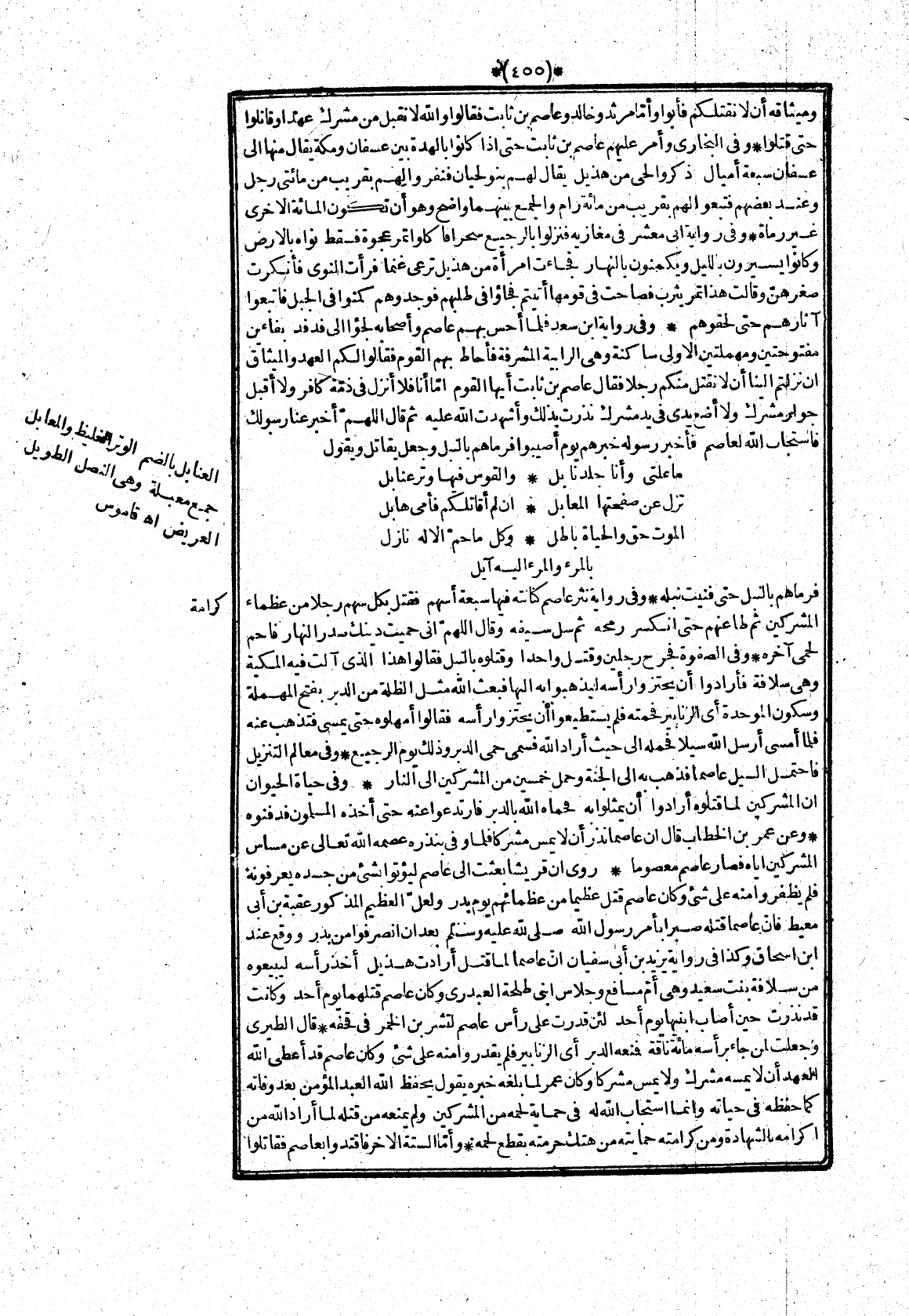 وفى رواية نثر عاصم كنانته فيها سبعة أسهم فقتل بكل سهم رجلا من عظماء المشركين ثم طاعنهم حتى انكسر رمحه ثم سل سيفه وقال اللهمّ انى حميت دينك صدر النهار فاحم لحمى آخره* وفى الصفوة فجرح رجلين وقتل واحدا وقتلوه بالنبل فقالوا هذا الذى آلت فيه المكية وهى سلافة فأرادوا أن يحتزوا رأسه ليذهبوا به اليها فبعث الله مثل الظلة من الدبر بفتح المهملة وسكون الموحدة أى الزنابير فحمته فلم يستطيعوا أن يحتزوا رأسه فقالوا أمهلوه حتى يمسى فتذهب عنه فلما أمسى أرسل الله سيلا فحمله الى حيث أراد الله فسمى حمى الدبر وذلك يوم الرجيع* وفى معالم التنزيل فاحتمل السيل عاصما فذهب به الى الجنة وحمل خمسين من المشركين الى النار* وفى حياة الحيوان ان المشركين لما قتلوه أرادوا أن يمثلوا به فحماه الله بالدبر فارتدعوا عنه حتى أخذه المسلمون فدفنوه* وعن عمر بن الخطاب قال ان عاصما نذر أن لا يمس مشركا فلما وفى بنذره عصمه الله تعالى عن مساس المشركين اياه فصار عاصم معصوما* روى ان قريشا بعثت الى عاصم ليؤتوا بشىء من جسده يعرفونه فلم يظفروا منه على شىء وكان عاصم قتل عظيما من عظمائهم يوم بدر ولعلّ العظيم المذكور عقبة بن أبى معيط فانّ عاصما قتله صبرا بأمر رسول الله صلّى الله عليه وسلم بعد ان انصرفوا من بدر ووقع عند ابن اسحاق وكذا فى رواية يزيد بن أبى سفيان انّ عاصما لما قتل أرادت هذيل أخذ رأسه ليبيعوه من سلافة بنت سعيد وهى أمّ مسافع وجلاس ابنى طلحة العبدرى وكان عاصم قتلهما يوم أحد وكانت قد نذرت حين أصاب ابنيها يوم أحد لئن قدرت على رأس عاصم لتشربن الخمر فى قحفه* قال الطيرى وجعلت لمن جاء برأسه مائة ناقة فمنعه الدبر أى الزنابير فلم يقدروا منه على شىء وكان عاصم قد أعطى الله العهد أن لا يمسه مشرك ولا يمس مشركا وكان عمر لما بلغه خبره يقول يحفظ الله العبد المؤمن بعد وفاته كما حفظه فى حياته وانما استجاب الله له فى حماية لحمه من المشركين ولم يمنعه من قتله لما أراد الله من اكرامه بالشهادة ومن كرامته حمايته من هتك حرمته بقطع لحمة* وأمّا الستة الاخر فاقتدوا بعاصم فقاتلوا
