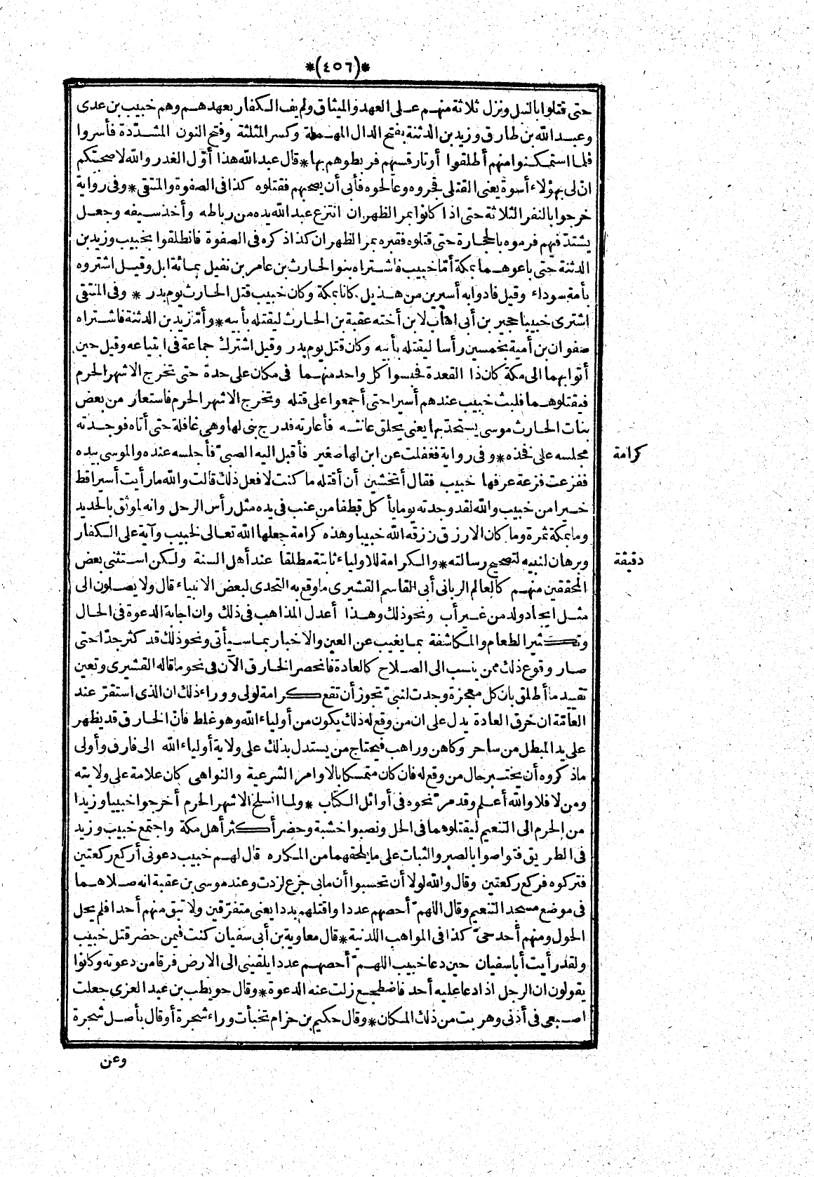 والكرامة للاولياء ثابتة مطلقا عند أهل السنة ولكن استثنى بعض المحققين منهم كالعالم الربانى أبى القاسم القشيرى ما وقع به التحدى لبعض الانبياء قال ولا يصلون الى مثل ايجاد ولد من غير أب ونحو ذلك وهذا أعدل المذاهب فى ذلك وان اجابة الدعوة فى الحال وتكثير الطعام والمكاشفة بما يغيب عن العين والاخبار بما سيأتى ونحو ذلك قد كثر جدّا حتى صار وقوع ذلك ممن ينسب الى الصلاح كالعادة فانحصر الخارق الآن فى نحو ما قاله القشيرى وتعين تقييد ما أطلق بان كل معجزة وجدت لنبىّ تجوز أن تقع كرامة لولى ووراء ذلك ان الذى استقرّ عند العامّة ان خرق العادة يدل على ان من وقع له ذلك يكون من أولياء الله وهو غلط فانّ الخارق قد يظهر على يد المبطل من ساحر وكاهن وراهب فيحتاج من يستدلّ بذلك على ولاية أولياء الله الى فارق وأولى ما ذكروه أن يختبر حال من وقع له فان كان متمسكا بالاوامر الشرعية والنواهى كان علامة على ولايته ومن لا فلا والله أعلم وقد مرّ نحوه فى أوائل الكتاب* ولما انسلخ الاشهر الحرم أخرجوا خبييا وزيدا من الحرم الى التنعيم ليقتلوهما فى الحل ونصبوا خشبة وحضر أكثر أهل مكة واجتمع خبيب وزيد فى الطريق فتواصوا بالصبر والثبات على ما يلحقهما من المكاره قال لهم خبيب دعونى أركع ركعتين فتركوه فركع ركعتين وقال والله لولا أن تحسبوا أن ما بى جزع لزدت وعند موسى بن عقبة انه صلاهما فى موضع مسجد التنعيم وقال اللهمّ أحصهم عددا واقتلهم بددا يعنى متفرّقين ولا تبق منهم أحدا فلم يحل الحول ومنهم أحد حىّ كذا فى المواهب اللدنية* قال معاوية بن أبى سفيان كنت فيمن حضر قتل خبيب ولقد رأيت أبا سفيان حين دعا خبيب اللهمّ أحصهم عددا يلقينى الى الارض فرقا من دعوته وكانوا يقولون ان الرجل اذا دعا عليه أحد فاضطجع زلت عنه الدعوة* وقال حويطب بن عبد العزى جعلت اصبعى فى أذنى وهربت من ذلك المكان* وقال حكيم بن حزام تخبأت وراء شجرة أو قال بأصل شجرة