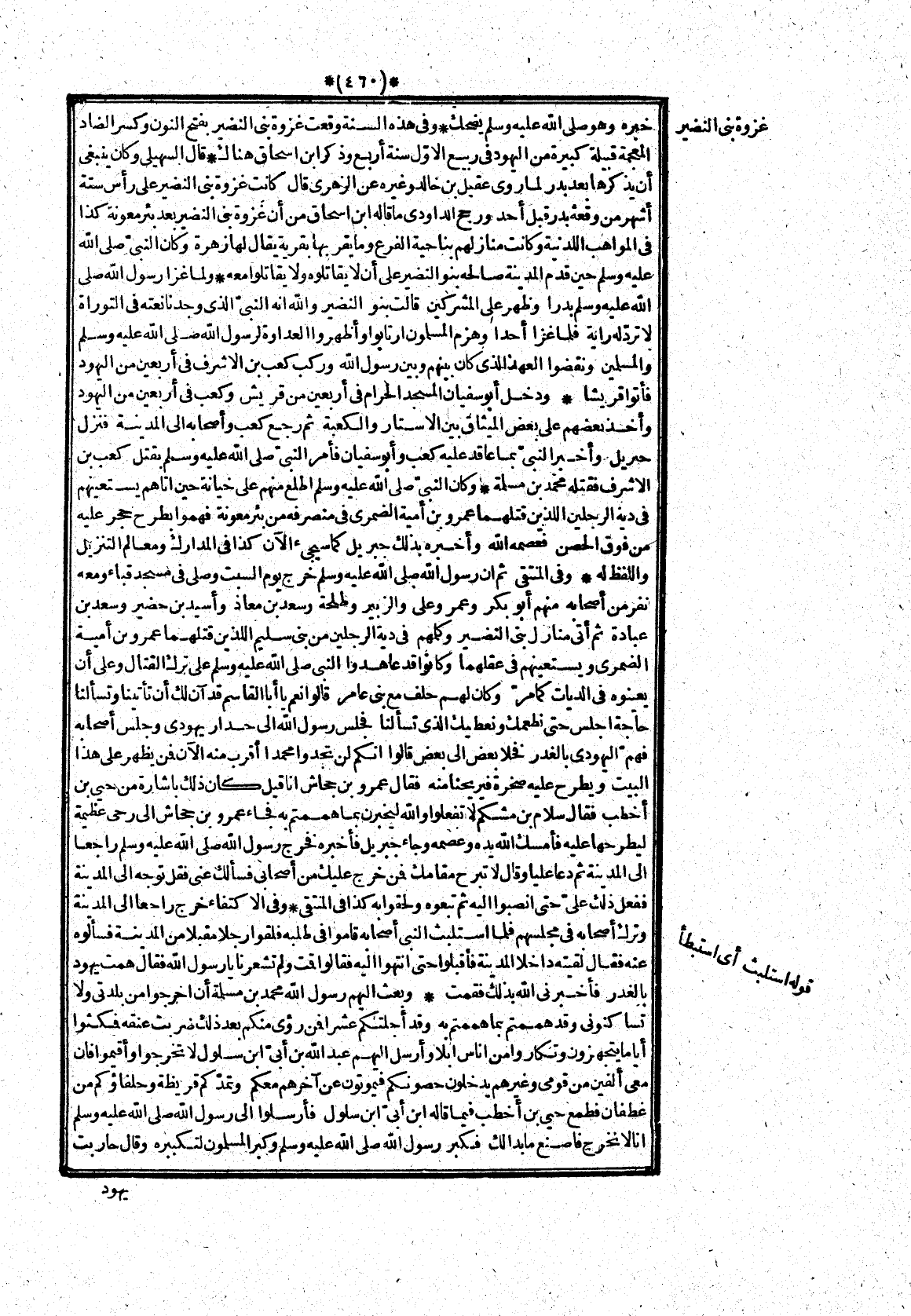 وفى هذه السنة وقعت غزوة بنى النضير بفتح النون وكسر الضاد المعجمة قبيلة كبيرة من اليهود فى ربيع الاوّل سنة أربع وذكر ابن اسحاق هناك* قال السهيلى وكان ينبغى أن يذكرها بعد بدر لما روى عقيل بن خالد وغيره عن الزهرى قال كانت غزوة بنى النضير على رأس ستة أشهر من وقعة بدر قبل أحد ورجح الداودى ما قاله ابن اسحاق من أن غزوة بنى النضير بعد بئر معونة كذا فى المواهب اللدنية وكانت منازلهم بناحية الفرع وما يقربها بقرية يقال لها زهرة وكان النبىّ صلّى الله عليه وسلم حين قدم المدينة صالحه بنو النضير على أن لا يقاتلوه ولا يقاتلوا معه* ولما غزا رسول الله صلّى الله عليه وسلم بدرا وظهر على المشركين قالت بنو النضير والله انه النبىّ الذى وجدنا نعته فى التوراة لا تردّ له راية فلما غزا أحدا وهزم المسلمون ارتابوا وأظهروا العداوة لرسول الله صلّى الله عليه وسلم والمسلمين ونقضوا العهد الذى كان بينهم وبين رسول الله وركب كعب بن الاشرف فى أربعين من اليهود فأتوا قريشا* ودخل أبو سفيان المسجد الحرام فى أربعين من قريش وكعب فى أربعين من اليهود وأخذ بعضهم على بعض الميثاق بين الاستار والكعبة ثم رجع كعب وأصحابه الى المدينة فنزل جبريل وأخبر النبىّ بما عاقد عليه كعب وأبو سفيان فأمر النبىّ صلّى الله عليه وسلم بقتل كعب بن الاشرف فقتله محمد بن مسلمة* وكان النبىّ صلّى الله عليه وسلم اطلع منهم على خيانة حين اتاهم يستعينهم فى دية الرجلين اللذين قتلهما عمرو بن أمية الضمرى فى منصرفه من بئر معونة فهموا بطرح حجر عليه من فوق الحصن فعصمه الله وأخبره بذلك جبريل كما سيجىء الآن كذا فى المدارك ومعالم التنزيل واللفظ له* وفى المنتقى ثم ان رسول الله صلّى الله عليه وسلم خرج يوم السبت وصلّى فى مسجد قباء ومعه نفر من أصحابه منهم أبو بكر وعمرو على والزبير وطلحة وسعد بن معاذ وأسيد بن حضير وسعد بن عبادة ثم أتى منازل بنى النضير وكلمهم فى دية الرجلين من بنى سليم اللذين قتلهما عمرو بن أمية الضمرى ويستعينهم فى عقلهما وكانوا قد عاهدوا النبى صلّى الله عليه وسلم على ترك القتال وعلى أن يعينوه فى الديات كما مرّ وكان لهم حلف مع بنى عامر قالوا نعم يا أبا القاسم قد آن لك أن تأتينا وتسألنا حاجة اجلس حتى نطعمك ونعطيك الذى تسألنا فجلس رسول الله الى حدار يهودى وجلس أصحابه فهمّ اليهودى بالغدر فخلا بعض الى بعض قالوا انكم لن تجدوا محمدا أقرب منه الآن فمن يظهر على هذا البيت ويطرح عليه صخرة فيريحنا منه فقال عمرو بن جحاش انا قيل كان ذلك باشارة من حيى بن أخطب فقال سلام بن مشكم لا تفعلوا والله ليخبرن بما هممتم به فجاء عمرو بن جحاش الى رحى عظيمة ليطرحها عليه فأمسك الله يده وعصمه وجاء جبريل فأخبره فخرج رسول الله صلّى الله عليه وسلم راجعا الى المدينة ثم دعا عليا وقال لا تبرح مقامك فمن خرج عليك من أصحابى فسألك عنى فقل توجه الى المدينة ففعل ذلك علىّ حتى انصبوا اليه ثم تبعوه ولحقوا به كذا فى المنتقى* وفى الاكتفاء خرج راجعا الى المدينة وترك أصحابه فى مجلسهم فلما استلبث النبى أصحابه قاموا فى طلبه فلقوا رجلا مقبلا من المدينة فسألوه عنه فقال لقيته داخلا المدينة فأقبلوا حتى انتهوا اليه فقالوا قمت ولم تشعرنا يا رسول الله فقال همت يهود بالغدر فأخبرنى الله بذلك فقمت* وبعث اليهم رسول الله محمد بن مسلمة أن اخرجوا من بلدتى ولا تساكنونى وقد هممتم بما هممتم به وقد أجلتكم عشرا فمن رؤى منكم بعد ذلك ضربت عنقه فمكثوا أياما يتجهزون وتكاروا من اناس ابلا وأرسل اليهم عبد الله بن أبىّ ابن سلول لا تخرجوا وأقيموا فان معى ألفين من قومى وغيرهم يدخلون حصونكم فيموتون عن آخرهم معكم وتمدّكم قريظة وحلفاؤكم من غطفان فطمع حيى بن أخطب فيما قاله ابن أبىّ ابن سلول فأرسلوا الى رسول الله صلّى الله عليه وسلم انا لا نخرج فاصنع ما بدا لك فكبر رسول الله صلّى الله عليه وسلم وكبر المسلمون لتكبيره