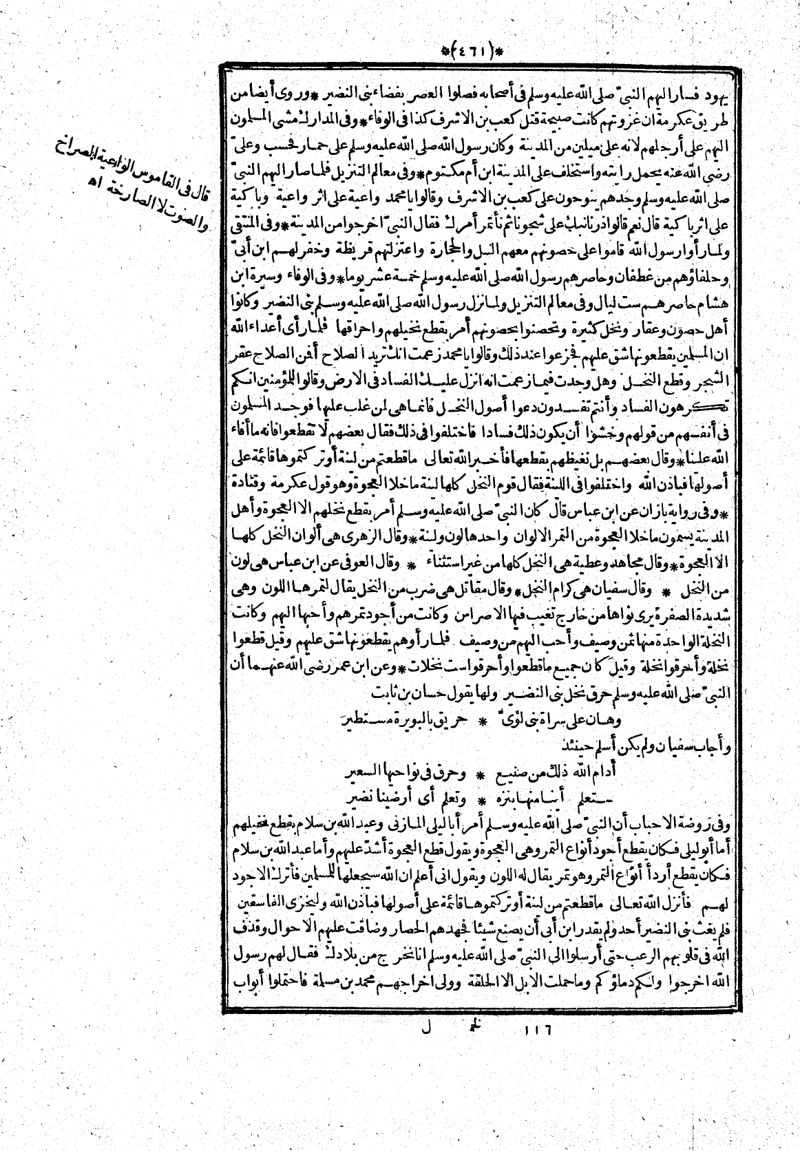 يهود فسار اليهم النبىّ صلّى الله عليه وسلم فى أصحابه فصلوا العصر بفضاء بنى النضير* وروى أيضا من طريق عكرمة ان غزوتهم كانت صبيحة قتل كعب بن الاشرف كذا فى الوفاء* وفى المدارك مشى المسلمون اليهم على أرجلهم لانه على ميلين من المدينة وكان رسول الله صلّى الله عليه وسلم على حمار فحسب وعلىّ رضى الله عنه يحمل رايته واستخلف على المدينة ابن أم مكتوم* وفى معالم التنزيل فلما صار اليهم النبىّ صلى الله عليه وسلم وجدهم ينوحون على كعب بن الاشرف وقالوا يا محمد واعية على اثر واعية وباكية على اثر باكية قال نعم قالوا ذرنا نبك على شجونا ثم نأتمر أمرك فقال النبىّ اخرجوا من المدينة* وفى المنتقى ولما رأوا رسول الله قاموا على حصونهم معهم النبل والحجارة واعتزلتهم قريظة وخفر لهم ابن أبىّ وحلفاؤهم من غطفان وحاصرهم رسول الله صلّى الله عليه وسلم خمسة عشر يوما* وفى الوفاء وسيرة ابن هشام حاصرهم ست ليال وفى معالم التنزيل ولما نزل رسول الله صلّى الله عليه وسلم بنى النضير وكانوا أهل حصون وعقار ونخل كثيرة وتحصنوا بحصونهم أمر بقطع نخيلهم واحراقها فلما رأى أعداء الله ان المسلمين يقطعونها شق عليهم فجزعوا عند ذلك وقالوا يا محمد زعمت انك تريد الصلاح أفمن الصلاح عقر الشجر وقطع النخل وهل وجدت فيما زعمت انه انزل عليك الفساد فى الارض وقالوا للمؤمنين انكم تكرهون الفساد وأنتم تفسدون دعوا أصول النخل فانما هى لمن غلب عليها فوجد المسلمون فى أنفسهم من قولهم وخشوا أن يكون ذلك فسادا فاختلفوا فى ذلك فقال بعضهم لا تقطعوا فانه ما أفاء الله علينا* وقال بعضهم بل نغيظهم بقطعها فأخبر الله تعالى ما قطعتم من لينة أو تركتموها قائمة على أصولها فباذن الله واختلفوا فى اللينة فقال قوم النخل كلها لينة ما خلا العجوة وهو قول عكرمة وقتادة* وفى رواية بازان عن ابن عباس قال كان النبىّ صلّى الله عليه وسلم أمر بقطع نخلهم الا العجوة وأهل المدينة يسمون ما خلا العجوة من التمر الالوان واحدها لون ولينة* وقال الزهرى هى ألوان النخل كلها الا العجوة* وقال مجاهد وعطية هى النخل كلها من غير استثناء* وقال العوفى عن ابن عباس هى لون من النخل* وقال سفيان هى كرام النخل* وقال مقاتل هى ضرب من النخل يقال لتمرها اللون وهى شديدة الصفرة يرى نواها من خارج تغيب فيها الاصراس وكانت من أجود تمرهم وأحبها اليهم وكانت النخلة الواحدة منها ثمن وصيف وأحب اليهم من وصيف فلما رأوهم بقطعونها شق عليهم وقيل قطعوا نخلة وأحرقوا نخلة وقيل كان جميع ما قطعوا وأحرقوا ست نخلات* وعن ابن عمر رضى الله عنهما أن النبىّ صلّى الله عليه وسلم حرق نخل بنى النضير ولها يقول حسان بن ثابت