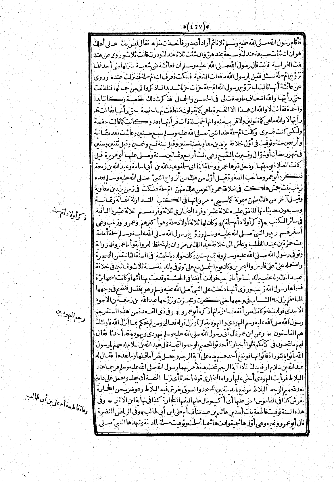 فأقام رسول الله صلّى الله عليه وسلم ثلاثا ثم أراد أن يدور فأخذت بثوبه فقال ليس بك على أهلك هو ان ان شئت سبعة عندك وسبعة عندهنّ وان شئت ثلاثا عندك ودرت قالت ثلاث وروى عن هند بنت الفراسية قالت قال رسول الله صلّى الله عليه وسلم ان لعائشة منى شعبة ما نزلها منى أحد فلما تزوّج امّ سلمة سئل فقيل يا رسول الله ما فعلت الشعبة فسكت فعرف ان امّ سلمة قد نزلت عنده وروى عن عائشة أنها قالت لما تزوّج رسول الله امّ سلمة حزنت حزنا شديدا لما ذكروا لى من جمالها فتلطفت حتى رأيتها والله اضعاف ما وصفت لى فى الحسن والجمال فذكرت ذلك لحفصة وكانتا يدا واحدة فقالت لا والله ان هذا الا الغيرة ما هى كما يقولون فتلطفت بها حفصة حتى رأتها فقالت قد رأيتها لا والله ما هى كما تقولين ولا قريب منه وانها لجميلة قالت فرأيتها بعد وكانت كما قالت حفصة ولكنى كنت غيرى وكانت امّ سلمة عند النبىّ صلّى الله عليه وسلم سبع سنين وعاشت بعده ثمانية وأربعين سنة وتوفيت فى أوّل خلافة يزيد بن معاوية سنة ستين وقيل سنة تسع وخمسين وقيل ثنتين وستين فى شهر رمضان أو شوّال وقبرت بالبقيع وهى بنت أربع وثمانين سنة وصلّى عليها أبو هريرة قيل كانت الصلاة بوصيتها ودخل قبرها عمرو وسلمة ابنا ابى سلمة وعبد الله بن أبى اسامة وعبد الله بن زمعة ذكره أبو عمرو صاحب الصفوة قيل أوّل من هلك من أزواج النبىّ صلّى الله عليه وسلم بعده زينب بنت جحش هلكت فى خلافة عمرو آخر من هلك منهنّ امّ سلمة هلكت فى زمن يزيد بن معاوية وقيل آخر من هلك منهنّ ميمونة كما سيجىء مروياتها فى الكتب المتداولة ثلثمائة وثمانية وسبعون حديثا منها المتفق عليه ثلاثة عشر وفرد البخارى ثلاثة وفرد مسلم ثلاثة عشروا الباقية فى سائر الكتب*