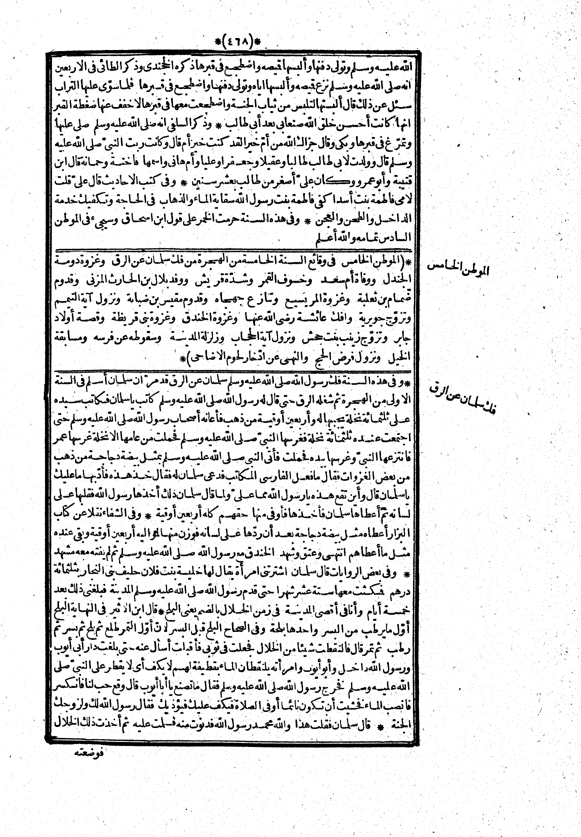 فك سلمان عن الرق وغزوة دومة الجندل ووفاة أم سعد وخسوف القمر وشدّة قريش ووفد بلال بن الحارث المزنى وقدوم ضمام بن ثعلبة وغزوة المريسيع وتنازع جهجاه وقدوم مقيس بن ضبابة ونزول آية التيمم وتزوّج جويرية وافك عائشة رضى الله عنها وغزوة الخندق وغزوة بنى قريظة وقصة أولاد جابر وتزوّج زينب بنت جحش ونزول آية الحجاب وزلزلة المدينة وسقوطه عن فرسه ومسابقة الخيل ونزول فرض الحج والنهى عن ادّخار لحوم الاضاحى) *