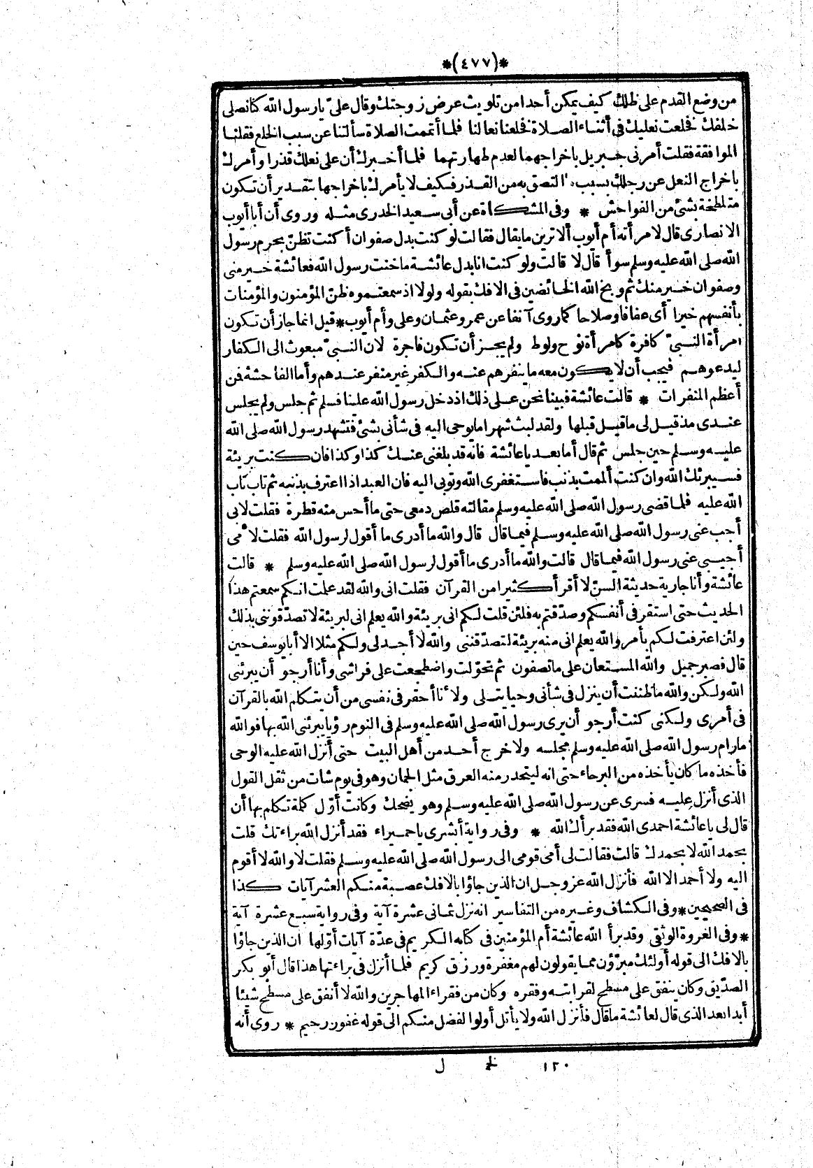 من وضع القدم على ظلك كيف يمكن أحدا من تلويث عرض زوجتك وقال علىّ يا رسول الله كنا نصلى خلفك فجعلت نعليك فى أثناء الصلاة فخلعنا نعالنا فلما أتممت الصلاة سألتنا عن سبب الخلع فقلنا الموافقة فقلت أمرنى جبريل باخراجهما لعدم طهارتهما فلما أخبرك أن على نعلك قذرا وأمرك باخراج النعل عن رجلك بسبب ما التصق به من القذر فكيف لا يأمرك باخراجها بتقدير أن تكون متلطخة بشىء من الفواحش* وفى المشكاة عن أبى سعيد الخدرى مثله وروى أن أبا أيوب الانصارى قال لامرأته أم أيوب ألا ترين ما يقال فقالت لو كنت بدل صفوان أكنت تظنّ بحرم رسول الله صلّى الله عليه وسلم سوأ قال لا قالت ولو كنت انا بدل عائشة ما خنت رسول الله فعائشة خير منى وصفوان خير منك ثم وبخ الله الخائضين فى الافك بقوله ولولا اذ سمعتموه ظنّ المؤمنون والمؤمنات بأنفسهم خيرا أى عفافا وصلاحا كما روى آنفا عن عمر وعثمان وعلى وأم أيوب* قيل انما جاز أن تكون امرأة النبىّ كافرة كامرأة نوح ولوط ولم يجز أن تكون فاجرة لان النبىّ مبعوث الى الكفار ليدعوهم فيجب أن لا يكون معه ما ينفرهم عنه والكفر غير منفر عندهم وأما الفاحشة فمن أعظم المنفرات* قالت عائشة فبينا نحن على ذلك اذ دخل رسول الله علينا فسلم ثم جلس ولم يجلس عندى مذ قيل لى ما قيل قبلها ولقد لبث شهرا ما يوحى اليه فى شأنى بشىء فتشهد رسول الله صلّى الله عليه وسلم حين جلس ثم قال أما بعد يا عائشة فانه قد بلغنى عنك كذا وكذا فان كنت بريئة فسيبرئك الله وان كنت ألممت بذنب فاستغفرى الله وتوبى اليه فان العبد اذا اعترف بذنبه ثم تاب تاب الله عليه فلما قضى رسول الله صلّى الله عليه وسلم مقالته قلص دمعى حتى ما أحس منه قطرة فقلت لابى أجب عنى رسول الله صلّى الله عليه وسلم فيما قال قال والله ما أدرى ما أقول لرسول الله فقلت لأمى أجيبى عنى رسول الله فيما قال قالت والله ما أدرى ما أقول لرسول الله صلّى الله عليه وسلم* قالت عائشة وأنا جارية حديثة السنّ لا أقرأ كثيرا من القرآن فقلت انى والله لقد علمت انكم سمعتم هذا الحديث حتى استقر فى أنفسكم وصدّقتم به فلئن قلت لكم انى بريئة والله يعلم انى لبريئة لا تصدّقوننى بذلك ولئن اعترفت لكم بأمر والله يعلم انى منه بريئة لتصدّقننى والله لا أجد لى ولكم مثلا الا أبا يوسف حين قال فصبر جميل والله المستعان على ما تصفون ثم تحوّلت واضطجعت على فراشى وأنا أرجو أن يبرئنى الله ولكن والله ما ظننت أن ينزل فى شأنى وحيا يتلى ولأنا أحقر فى نفسى من أن يتكلم الله بالقرآن فى أمرى ولكنى كنت أرجو أن يرى رسول الله صلّى الله عليه وسلم فى النوم رؤيا يبرئنى الله بها فو الله ما رام رسول الله صلّى الله عليه وسلم مجلسه ولاخرج أحد من أهل البيت حتى أنزل الله عليه الوحى فأخذه ما كان يأخذه من البرحاء حتى انه ليتحدر منه العرق مثل الجمان وهو فى يوم شات من ثقل القول الذى أنزل عليه فسرى عن رسول الله صلّى الله عليه وسلم وهو يضحك وكانت أوّل كلمة تكلم بها أن قال لى يا عائشة احمدى الله فقد برأك الله* وفى رواية أبشرى يا حميراء فقد أنزل الله براءتك قلت بحمد الله لا بحمدك قالت فقالت لى أمى قومى الى رسول الله صلّى الله عليه وسلم فقلت لا والله لا أقوم اليه ولا أحمد الا الله فأنزل الله عز وجل ان الذين جاؤا بالافك عصبة منكم العشر آيات كذا فى الصحيحين* وفى الكشاف وغيره من التفاسير انه نزل ثمانى عشرة آية وفى رواية سبع عشرة آية* وفى العروة الوثقى وقد برأ الله عائشة أم المؤمنين فى كتابه الكريم فى عدّة آيات أوّلها ان الذين جاؤا بالافك الى قوله أولئك مبرّؤن مما يقولون لهم مغفرة ورزق كريم فلما أنزل فى براءتها هذا قال أبو بكر الصدّيق وكان ينفق على مسطح لقرابته وفقره وكان من فقراء المهاجرين والله لا أنفق على مسطح شيئا أبدا بعد الذى قال لعائشة ما قال