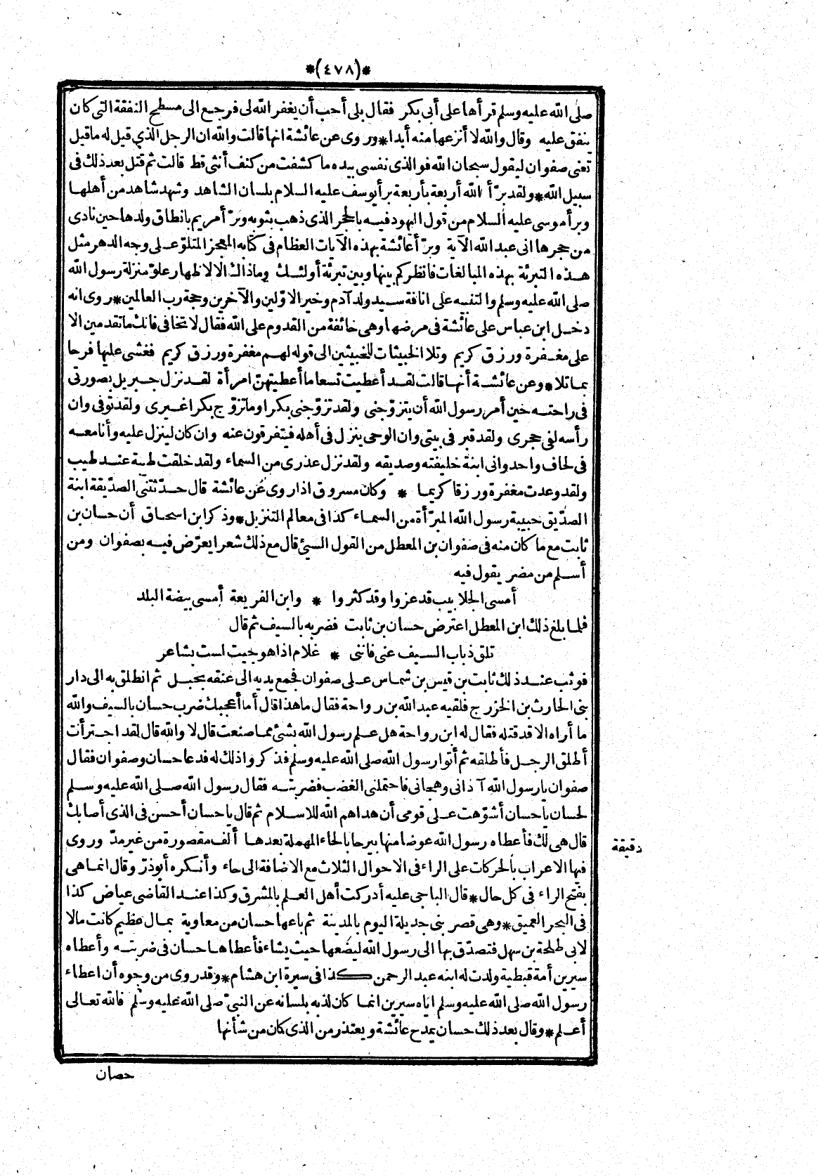 فوثب عند ذلك ثابت بن قيس بن شماس على صفوان فجمع يديه الى عنقه بحبل ثم انطلق به الى دار بنى الحارث بن الخزرج فلقيه عبد الله بن رواحة فقال ما هذا قال أما أعجبك ضرب حسان بالسيف والله ما أراه الا قد قتله فقال له ابن رواحة هل علم رسول الله بشىء مما صنعت قال لا والله قال لقد اجترأت أطلق الرجل فأطلقه ثم أتوا رسول الله صلّى الله عليه وسلم فذكروا ذلك له فدعا حسان وصفوان فقال صفوان يا رسول الله آذانى وهجانى فاحتملنى الغضب فضربته فقال رسول الله صلّى الله عليه وسلم لحسان يا حسان أشوّهت على قومى أن هداهم الله للاسلام ثم قال يا حسان أحسن فى الذى أصابك قال هى لك فأعطاه رسول الله عوضا منها بيرحا بالحاء المهملة بعدها ألف مقصورة من غير مدّ وروى فيها الاعراب بالحركات على الراء فى الاحوال الثلاث مع الاضافة الى حاء وأنكره أبو ذرّ وقال انما هى بفتح الراء فى كل حال* قال الباجى عليه أدركت أهل العلم بالمشرق وكذا عند القاضى عياض كذا فى البحر العميق* وهى قصر بنى جديلة اليوم بالمدينة ثم باعها حسان من معاوية بمال عظيم كانت مالا لابى طلحة بن سهل فتصدّق بها الى رسول الله ليضعها حيث يشاء فأعطاها حسان فى ضربته وأعطاه سيرين أمة قبطية ولدت له ابنه عبد الرحمن كذا فى سيرة ابن هشام* وقد روى من وجوه أن اعطاء رسول الله صلّى الله عليه وسلم اياه سيرين انما كان لذبه بلسانه عن النبىّ صلّى الله عليه وسلم فالله تعالى أعلم* وقال بعد ذلك حسان يمدح عائشة ويعتذر من الذى كان من شأنها