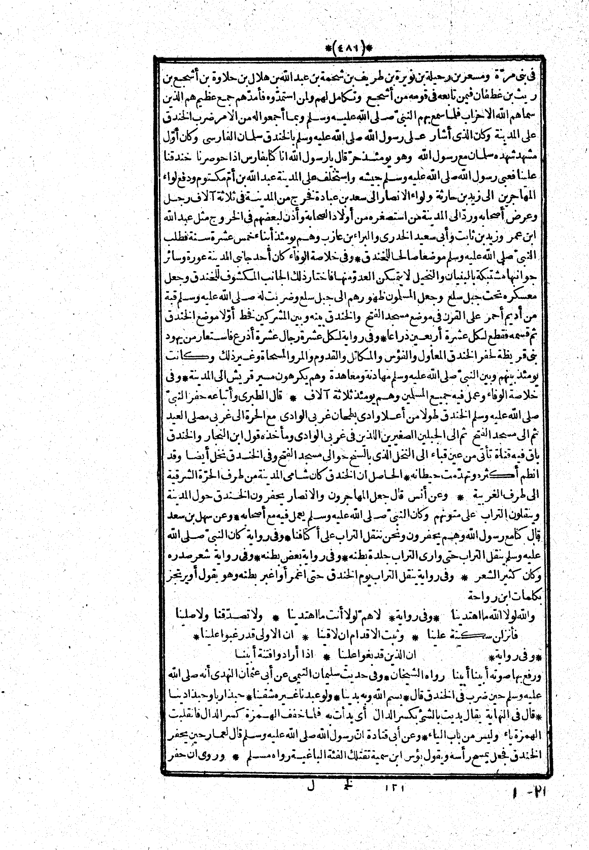 فى بنى مرّة ومسعر بن رحيلة بن نويرة بن طريف بن شحمة بن عبد الله بن هلال بن حلاوة بن أشجع بن ريث بن غطفان فيمن تابعه فى قومه من أشجع وتكامل لهم ولمن استمدّوه فأمدّهم جمع عظيم هم الذين سماهم الله الاحزاب فلما سمع بهم النبىّ صلّى الله عليه وسلم وبما أجمعوا له من الامر ضرب الخندق على المدينة وكان الذى أشار على رسول الله صلّى الله عليه وسلم بالخندق سلمان الفارسى وكان أوّل مشهد شهده سلمان مع رسول الله وهو يومئذ حرّ قال يا رسول الله انا كنا بفارس اذا حوصرنا خندقنا علينا فعبى رسول الله صلّى الله عليه وسلم جيشه واستخلف على المدينة عبد الله بن أمّ مكتوم ودفع لواء المهاجرين الى زيد بن حارثة ولواء الانصار الى سعد بن عبادة فخرج من المدينة فى ثلاثة آلاف رجل وعرض أصحابه وردّ الى المدينة من استصغره من أولاد الصحابة وأذن لبعضهم فى الخروج مثل عبد الله ابن عمر وزيد بن ثابت وأبى سعيد الخدرى والبراء بن عازب وهم يومئذ أبناء خمس عشرة سنة فطلب النبىّ صلّى الله عليه وسلم موضعا صالحا للخندق* وفى خلاصة الوفاء كان أحد جانبى المدينة عورة وسائر جوانبها مشتبكة بالبنيان والنخيل لا يتمكن العدوّ منها فاختار ذلك الجانب المكشوف للخندق وجعل معسكره تحت جبل سلع وجعل المسلمون ظهورهم الى جبل سلع وضربت له صلّى الله عليه وسلم قبة من أديم أحمر على القرن فى موضع مسجد الفتح والخندق بينه وبين المشركين فخط أوّلا موضع الخندق ثم قسمه فقطع لكل عشرة أربعين ذراعا* وفى رواية لكل عشرة رجال عشرة أذرع فاستعار من يهود بنى قريظة لحفر الخندق المعاول والفؤس والمكاتل والقدوم والمرو المسحاة وغير ذلك وكانت يومئذ بينهم وبين النبىّ صلّى الله عليه وسلم مهادنة ومعاهدة وهم يكرهون مسير قريش الى المدينة* وفى خلاصة الوفاء وعمل فيه جميع المسلمين وهم يومئذ ثلاثة آلاف* قال الطبرى وأتباعه حفر النبىّ صلى الله عليه وسلم الخندق طولا من أعلا وادى بطحان غربى الوادى مع الحرة الى غربى مصلى العيد ثم الى مسجد الفتح ثم الى الجبلين الصغيرين اللذين فى غربى الوادى ومأخذه قول ابن النجار والخندق باق فيه قناة تأتى من عين قباء الى النخل الذى بالسنح حوالى مسجد الفتح وفى الخندق نخل أيضا وقد انطم أكثره وتهدّمت حيطانه* الحاصل ان الخندق كان شامى المدينة من طرف الحرّة الشرقية الى طرف الغربية* وعن أنس قال جعل المهاجرون والانصار يحفرون الخندق حول المدينة وينقلون التراب على متونهم وكان النبىّ صلّى الله عليه وسلم يعمل فيه مع أصحابه* وعن سهل بن سعد قال كنا مع رسول الله وهم يحفرون ونحن ننقل التراب على أكتافنا* وفى رواية كان النبىّ صلّى الله عليه وسلم ينقل التراب حتى وارى التراب جلدة بطنه* وفى رواية بعض بطنه* وفى رواية شعر صدره وكان كثير الشعر* وفى رواية ينقل التراب يوم الخندق حتى اغمر أو اغبر بطنه وهو يقول أو يرتجز بكلمات ابن رواحة