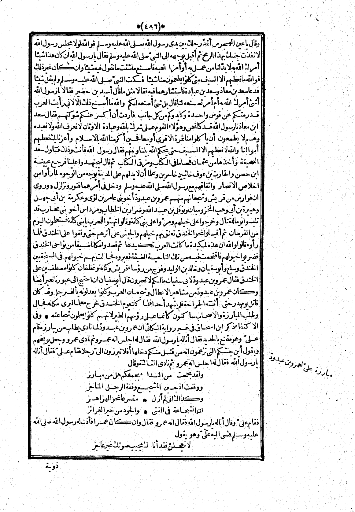 وقال يا عين الهجرس أتمدّ رجلك بين يدى رسول الله صلّى الله عليه وسلم فو الله لولا مجلس رسول الله لانفذت جنبك بهذا الرمح ثم أقبل بوجهه الى النبىّ صلّى الله عليه وسلم فقال يا رسول الله ان كان هذا شيئا أمرك الله به لا بدّ لنا من عمل به أو أمرا تحبه فاصنع ما شئت ما نقول فيه شيئا وان كان غير ذلك فو الله ما نعطيهم الا السيف متى كانوا يطعمون منا شيئا فسكت النبىّ صلّى الله عليه وسلم ولم يقل شيئا فدعا سعد بن معاذ وسعد بن عبادة فاستشارهما فيه فقالا مثل ما قال أسيد بن حضير فقالا يا رسول الله أشىء أمرك الله به أم أمر تصنعه لنا قال بل شىء أصنعه لكم والله ما أصنع ذلك الا لانى رأيت العرب قد رمتكم عن قوس واحدة وكايدوكم من كل جانب فأردت أن أكسر عنكم شوكتهم فقال سعد ابن معاذ يا رسول الله قد كنا نحن وهؤلاء القوم على شرك بالله وعبادة الاوثان لا نعرف الله ولا نعبده وهم لا يطمعون أن يأكلوا منا ثمرة الاقرى أو بيعا فحين أكرمنا الله بالاسلام وأعزنا بك نعطيهم أموالنا والله لا نعطيهم الا السيف حتى يحكم الله بيننا وبينهم فقال رسول الله فأنت وذلك فتناول سعد الصحيفة وأخذها من عثمان فمحاما فى الكتاب ومزق الكتاب ثم قال ليجتهدوا علينا فرجع عيينة ابن حصن والحارث بن عوف خائبين خاسرين وعلما أن لا يدلهم على المدينة بوجه من الوجوه لما رأوا من اخلاص الانصار واتفاقهم مع رسول الله صلّى الله عليه وسلم ودخل فى أمرهما فتور وتزلزل* وروى ان فوارس من قريش وشجعانهم منهم عمرو بن عبدودّ أخو بنى عامر بن لؤى وعكرمة بن أبى جهل وهبيرة بن أبى وهب المخزوميان ونوفل بن عبد الله وضرار بن الخطاب ومرداس أخو بنى محارب قد تلبسوا يوما للقتال وخرجوا على خيلهم ومرّوا على بنى كنانة وقالوا تهيئوا للحرب يا بنى كنانة فستعلمون اليوم من الفرسان ثم أقبلوا نحو الخندق تعنق بهم خيلهم والجيش على أثرهم حتى وقفوا على الخندق فلما رأوه قالوا والله ان هذه لمكيدة ما كانت العرب تكيدها ثم قصدوا مكانا ضيقا من نواحى الخندق فضربوا خيولهم فاقتحمت فيه من تلك الناحية الضيقة فعبروه فجالت بهم خيولهم فى السبخة بين الخندق وسلع وأبو سفيان وخالد بن الوليد وفوج من رؤساء قريش وكنانة وغطفان كانوا مصطفين على الخندق فقال عمرو بن عبدودّ لابى سفيان ما لكم لا تعبرون قال أبو سفيان ان احتيج الى عبورنا نعبر أيضا وكان عمرو بن عبدودّ من مشاهير الابطال وشجعان العرب وكانوا يعدلونه بألف رجل وقد كان قاتل يوم بدر حتى أثبتته الجراحة فلم يشهد أحدا فلما كان يوم الخندق خرج معلما ليرى مكانه فجال وطلب المبارزة والاصحاب ساكتون كأنما على رؤسهم الطير لانهم كانوا يعلمون شجاعته*
