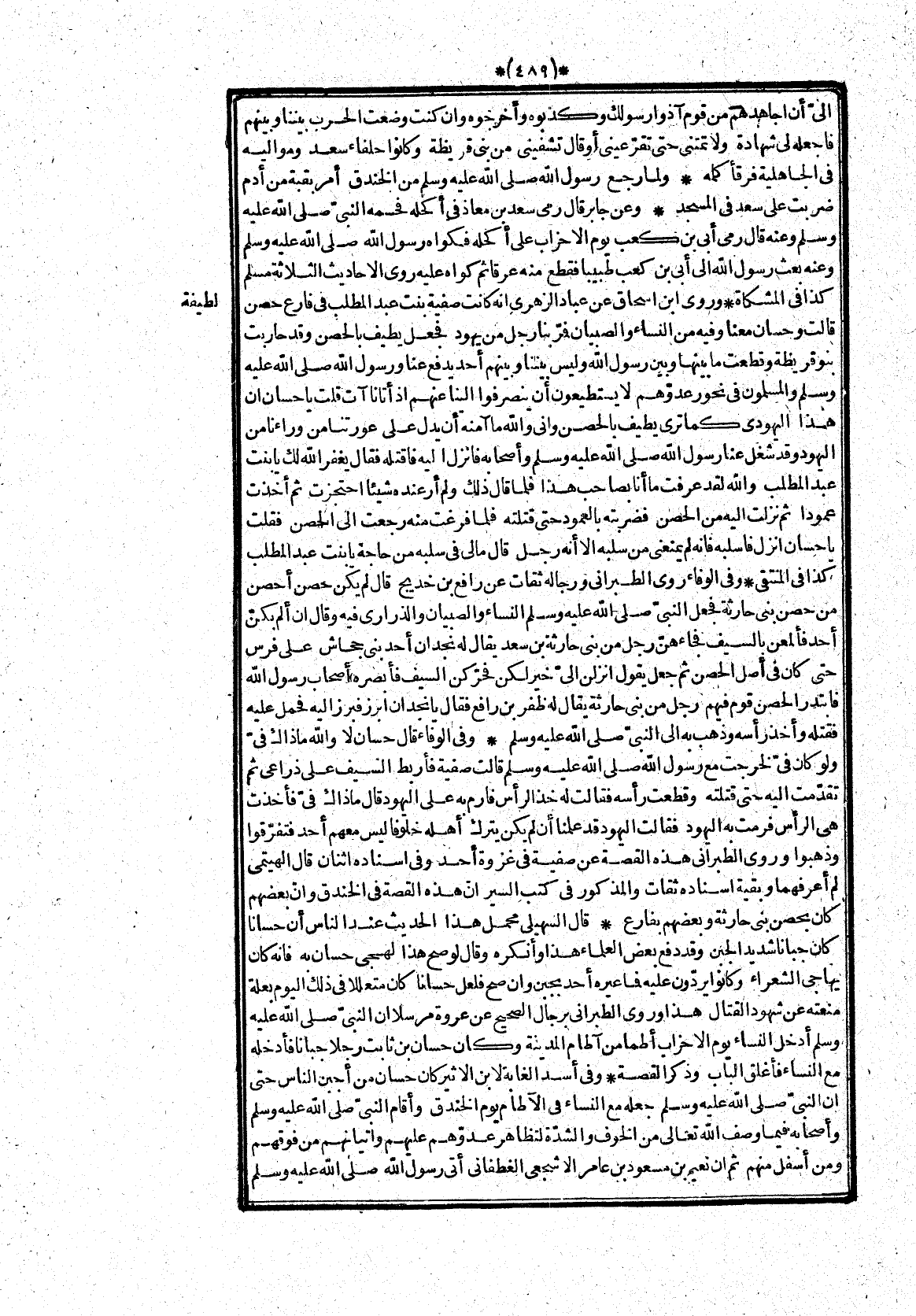 وروى ابن اسحاق عن عباد الزهرى انه كانت صفية بنت عبد المطلب فى فارع حصن قالت وحسان معنا وفيه من النساء والصبيان فمرّ بنا رجل من يهود فجعل يطيف بالحصن وقد حاربت بنو قريظة وقطعت ما بينها وبين رسول الله وليس بيننا وبينهم أحد يدفع عنا ورسول الله صلّى الله عليه وسلم والمسلمون فى نحور عدوّهم لا يستطيعون أن ينصرفوا الينا عنهم اذ أتانا آت قلت يا حسان ان هذا اليهودى كما ترى يطيف بالحصن وانى والله ما آمنه أن يدل على عورتنا من وراءنا من اليهود وقد شغل عنا رسول الله صلّى الله عليه وسلم وأصحابه فانزل اليه فاقتله فقال يغفر الله لك يا بنت عبد المطلب والله لقد عرفت ما أنا بصاحب هذا فلما قال ذلك ولم أر عنده شيئا احتجزت ثم أخذت عمودا ثم نزلت اليه من الحصن فضربته بالعمود حتى قتلته فلما فرغت منه رجعت الى الحصن فقلت يا حسان انزل فسلبه فانه لم يمنعنى من سلبه الا أنه رجل قال مالى فى سلبه من حاجة يا بنت عبد المطلب كذا فى المنتقى* وفى الوفاء روى الطبرانى ورجاله ثقات عن رافع بن خديج قال لم يكن حصن أحصن من حصن بنى حارثة فجعل النبىّ صلّى الله عليه وسلم النساء والصبيان والذرارى فيه وقال ان ألم بكنّ أحد فألمعن بالسيف فجاءهنّ رجل من بنى حارثة بن سعد يقال له نجدان أحد بنى جحاش على فرس حتى كان فى أصل الحصن ثم جعل يقول انزلن الىّ خير لكن فحرّكن السيف فأبصره أصحاب رسول الله فابتدر الحصن قوم فيهم رجل من بنى حارثة يقال له ظفر بن رافع فقال يا نجدان ابرز فبرز اليه فحمل عليه فقتله وأخذ رأسه وذهب به الى النبىّ صلّى الله عليه وسلم* وفى الوفاء قال حسان لا والله ما ذاك فىّ ولو كان فىّ لخرجت مع رسول الله صلّى الله عليه وسلم قالت صفية فأربط السيف على ذراعى ثم تقدّمت اليه حتى قتلته وقطعت رأسه فقالت له خذ الرأس فارم به على اليهود قال ما ذاك فىّ فأخذت هى الرأس فرمت به اليهود فقالت اليهود قد علمنا أن لم يكن يترك أهله خلوفا ليس معهم أحد فتفرّقوا وذهبوا وروى الطبرانى هذه القصة عن صفية فى غزوة أحد وفى اسناده اثنان قال الهيتمى لم أعرفهما وبقية اسناده ثقات والمذكور فى كتب السير انّ هذه القصة فى الخندق وانّ بعضهم كان بحصن بنى حارثة وبعضهم بفارع* قال السهيلى محمل هذا الحديث عند الناس أن حسانا كان جبانا شديد الجبن وقد دفع بعض العلماء هذا وأنكره وقال لو صح هذا لهجى حسان به فانه كان يهاجى الشعراء وكانوا يردّون عليه فما عيره أحد بجبن وان صح فلعل حسانا كان متعللا فى ذلك اليوم بعلة منعته عن شهود القتال هذا وروى الطبرانى برجال الصحيح عن عروة مرسلا ان النبىّ صلّى الله عليه وسلم أدخل النساء يوم الاحزاب أطما من آطام المدينة وكان حسان بن ثابت رجلا جبانا فأدخله مع النساء فأغلق الباب وذكر القصة* وفى أسد الغابة لابن الاثير كان حسان من أجبن الناس حتى ان النبىّ صلّى الله عليه وسلم جعله مع النساء فى الآطام يوم الخندق وأقام النبىّ صلّى الله عليه وسلم وأصحابه فيما وصف الله تعالى من الخوف والشدّة لتظاهر عدوّهم عليهم واتيانهم من فوقهم ومن أسفل منهم ثم ان نعيم بن مسعود بن عامر الاشجعى الغطفانى أتى رسول الله صلّى الله عليه وسلم