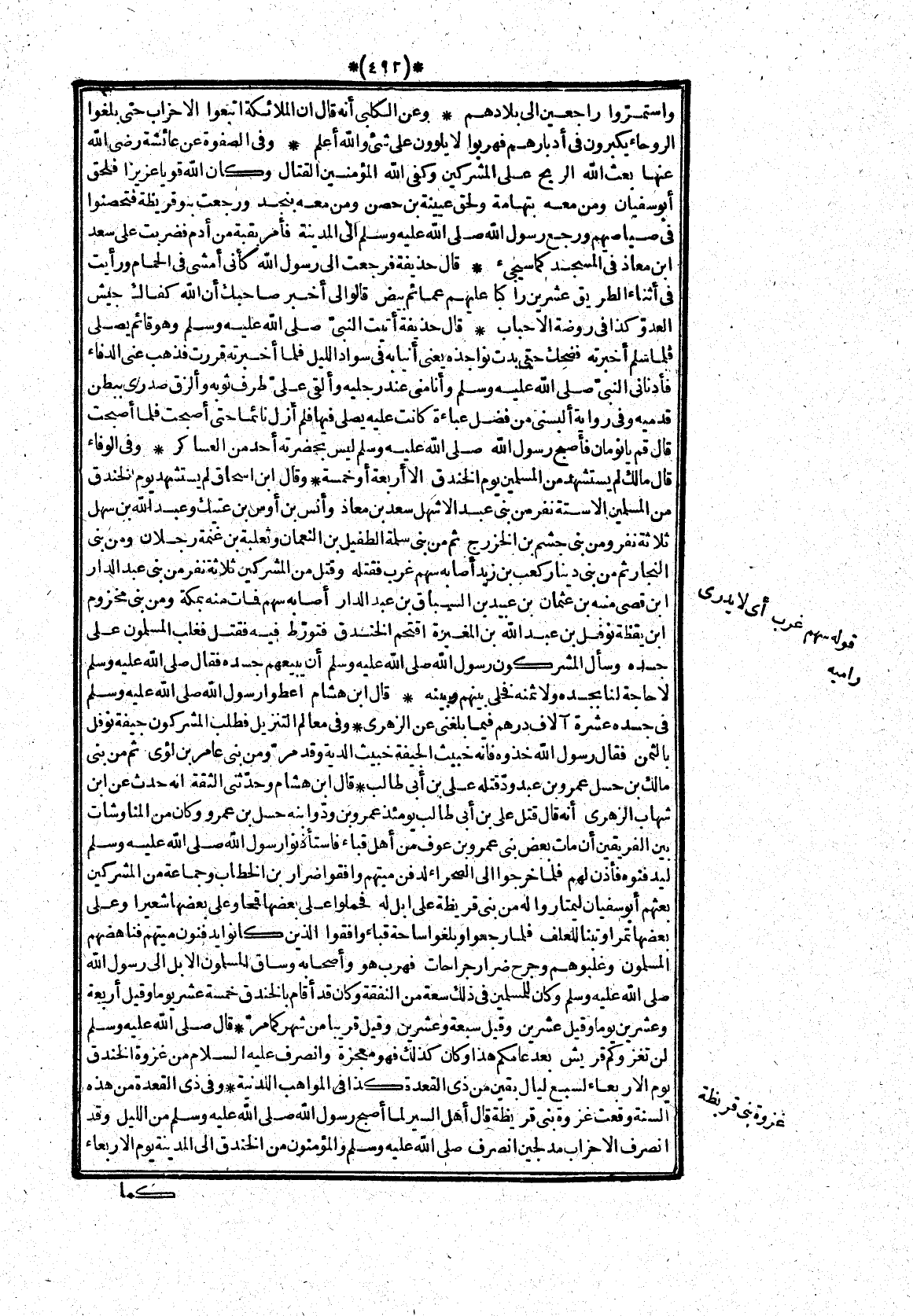 واستمرّوا راجعين الى بلادهم* وعن الكلبى أنه قال ان الملائكة اتبعوا الاحزاب حتى بلغوا الروحاء يكبرون فى أدبارهم فهربوا لا يلوون على شىء والله أعلم* وفى الصفوة عن عائشة رضى الله عنها بعث الله الريح على المشركين وكفى الله المؤمنين القتال وكان الله قويا عزيزا فلحق أبو سفيان ومن معه بتهامة ولحق عيينة بن حصن ومن معه بنجد ورجعت بنو قريظة فتحصنوا فى صياصيهم ورجع رسول الله صلّى الله عليه وسلم الى المدينة فأمر بقبة من أدم فضربت على سعد ابن معاذ فى المسجد كما سيجىء* قال حذيفة فرجعت الى رسول الله كأنى أمشى فى الحمام ورأيت فى أثناء الطريق عشرين راكبا عليهم عمائم بيض قالوا لى أخبر صاحبك أن الله كفاك جيش العدوّ كذا فى روضة الاحباب* قال حذيفة أتيت النبىّ صلّى الله عليه وسلم وهو قائم يصلى فلما سلم أخبرته فضحك حتى بدت نواجذه يعنى أنيابه فى سواد الليل فلما أخبرته قررت فذهب عنى الدفاء فأدنانى النبىّ صلّى الله عليه وسلم وأنا منى عند رجليه وألقى علىّ طرف ثوبه وألزق صدرى ببطن قدميه وفى رواية ألبسنى من فضل عباءة كانت عليه يصلى فيها فلم أزل نائما حتى أصبحت فلما أصبحت قال قم يا نومان فأصبح رسول الله صلّى الله عليه وسلم ليس بحضرته أحد من العساكر* وفى الوفاء قال مالك لم يستشهد من المسلمين يوم الخندق الا أربعة أو خمسة* وقال ابن اسحاق لم يستشهد يوم الخندق من المسلمين الاستة نفر من بنى عبد الاشهل سعد بن معاذ وأنس بن أوس بن عتيك وعبد الله بن سهل ثلاثة نفر ومن بنى جشم بن الخزرج ثم من بنى سلمة الطفيل بن النعمان وثعلبة بن غنمة رجلان ومن بنى النجار ثم من بنى دينار كعب بن زيد أصابه سهم غرب فقتله وقتل من المشركين ثلاثة نفر من بنى عبد الدار ابن قصى منبه بن عثمان بن عبيد بن السباق بن عبد الدار أصابه سهم فمات منه بمكة ومن بنى مخزوم ابن يقظة نوفل بن عبد الله بن المغيرة اقتحم الخندق فتورّط فيه فقتل فغلب المسلمون على جسده وسأل المشركون رسول الله صلّى الله عليه وسلم أن يبيعهم جسده فقال صلّى الله عليه وسلم لا حاجة لنا بجسده ولا ثمنه فخلى بينهم وبينه* قال ابن هشام اعطوا رسول الله صلّى الله عليه وسلم فى جسده عشرة آلاف درهم فيما بلغنى عن الزهرى* وفى معالم التنزيل فطلب المشركون جيفة نوفل بالثمن فقال رسول الله خذوه فانه خبيث الجيفة خبيث الدية وقد مرّ ومن بنى عامر بن لؤى ثم من بنى مالك بن حسل عمرو بن عبدودّ قتله على بن أبى طالب* قال ابن هشام وحدّثنى الثقة انه حدث عن ابن شهاب الزهرى أنه قال قتل على بن أبى طالب يومئذ عمرو بن ودّ وابنه حسل بن عمرو وكان من المناوشات بين الفريقين أن مات بعض بنى عمرو بن عوف من أهل قباء فاستأذنوا رسول الله صلّى الله عليه وسلم ليدفنوه فأذن لهم فلما خرجوا الى الصحراء لدفن ميتهم وافقوا ضرار بن الخطاب وجماعة من المشركين بعثهم أبو سفيان ليمتاروا له من بنى قريظة على ابل له فحملوا على بعضها قمحا وعلى بعضها شعيرا وعلى بعضها تمرا وتبنا للعلف فلما رجعوا وبلغوا ساحة قباء وافقوا الذين كانوا يدفنون ميتهم فناهضهم المسلمون وغلبوهم وجرح ضرار جراحات فهرب هو وأصحابه وساق المسلمون الابل الى رسول الله صلى الله عليه وسلم وكان للمسلمين فى ذلك سعة من النفقة وكان قد أقام بالخندق خمسة عشر يوما وقيل أربعة وعشرين يوما وقيل عشرين وقيل سبعة وعشرين وقيل قريبا من شهر كما مرّ* قال صلّى الله عليه وسلم لن تغزوكم قريش بعد عامكم هذا وكان كذلك فهو معجزة وانصرف عليه السلام من غزوة الخندق يوم الاربعاء لسبع ليال بقين من ذى القعدة كذا فى المواهب اللدنية*