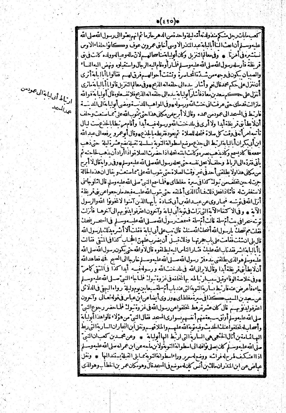 وفى المواهب اللدنية ومضى أبو لبابة الى المدينة فارتبط فى المسجد الى عمود من عمده وقال لا أبرح من مكانى هذا حتى يتوب الله علىّ مما صنعت وحلف أن لا يطأ بنى قريظة أبدا ولا أرى فى بلد خنت الله ورسوله فيه أبدا وأقام مرتبطا بالجذع ست ليال تأتيه امرأته فى وقت كل صلاة فتحله للصلاة ثم يعود فتربطه بالجذع* وقال أبو عمرو يرفعه الى عبد الله ابن أبى بكر ان أبا لبابة ارتبط الى جذع موضع اسطوانة التوبة يسلسلة ثقيلة بضع عشرة ليلة حتى ذهب سمعه فما كاد يسمع وكاد يذهب بصره وكانت ابنته تحله اذا حضرت الصلاة واذا أراد أن يذهب لحاجته ثم يأتى فتردّه الى الرباط وحلف لا يحل نفسه حتى يحله رسول الله صلّى الله عليه وسلم* وفى رواية قال لا أبرح من مكانى هذا ولا يطلقنى أحد فى غير وقت الصلاة حتى يتوب الله علىّ مما صنعت ويقال ان هذه الحالة جرت له حين تخلف من تبوك كذا فى سيرة مغلطاى* فلما سمع النبىّ صلّى الله عليه وسلم قال امّا لو جاءنى لاستغفرت له فأمّا اذا فعل ذلك فما أنا الذى أطلقه حتى يتوب الله عليه فبعد ما رجعوا عن بنى قريظة أنزل الله فى توبته فيما روى عن عبد الله بن أبى قتادة يأيها الذين آمنوا لا تخونوا الله والرسول الآية* وفى الاكتفاء الآية التى نزلت فى توبة أبى لبابة وآخرون اعترفوا بذنوبهم الى آخرها فأنزلت توبته سحرا فى بيت أمّ سلمة قالت أمّ سلمة فسمعت رسول الله صلّى الله عليه وسلم فى السحر يضحك فقلت مم تضحك يا رسول الله أضحك الله سنك قال تيب على أبى لبابة فقلت ألا أبشره بذلك يا رسول الله قال بلى ان شئت فقامت على باب حجرتها وذلك قبل أن يضرب عليهنّ الحجاب كذا فى المنتقى فقالت يا أبا لبابة ابشر فقد تاب الله عليك فثار الناس اليه ليطلقوه قال لا والله حتى يكون رسول الله صلّى الله عليه وسلم هو الذى يطلقنى بيده فمرّ رسول الله صلّى الله عليه وسلم خارجا الى الصبح فحله فعاهد الله أن لا يطأ بنى قريظة أبدا وقال لا يرانى الله فى بلد خنت الله ورسوله فيه أبدا كذا فى المنتقى كما مرّ* وفى خلاصة الوفاء وقيل سبب ارتباطه بها تخلفه فى غزوة تبوك فلما جاء النبىّ صلّى الله عليه وسلم جاءه فأعرض عنه فارتبط بسارية التوبة التى عند باب أمّ سلمة سبعا بين يوم وليلة رواه البيهقى فى الدلائل عن سعيد بن المسيب كذا فى سيرة مغلطاى* وروى أيضا عن ابن عباس فى قوله تعالى وآخرون اعترفوا بذنوبهم قال كان عشرة رهط تخلفوا عن رسول الله فى غزوة تبوك فلما حضر رجوع النبىّ صلى الله عليه وسلم أوثق سبعة منهم أنفسهم بسوارى المسجد فقال النبىّ من هؤلاء قالوا هذا أبو لبابة وأصحاب له تخلفوا عنك الحديث وفيه توبة الله عليهم واطلاقهم ونقل ابن النجار ان السارية التى ربط اليها ثمامة بن أثال الخثعمى هى السارية التى ارتبط اليها أبو لبابة* وعن محمد بن كعب ان النبىّ صلى الله عليه وسلم كان يصلى نوافله الى اسطوانة التوبة ولا بن ماجه عن ابن عمر انه صلّى الله عليه وسلم اذا اعتكف طرح له فراشه ووضع له سرير وراء اسطوانة التوبة مما يلى القبلة يستند اليها* ونقل عياض عن ابن المنذران مالك بن أنس كان له موضع فى المسجد قال وهو مكان عمر بن الخطاب وهو الذى