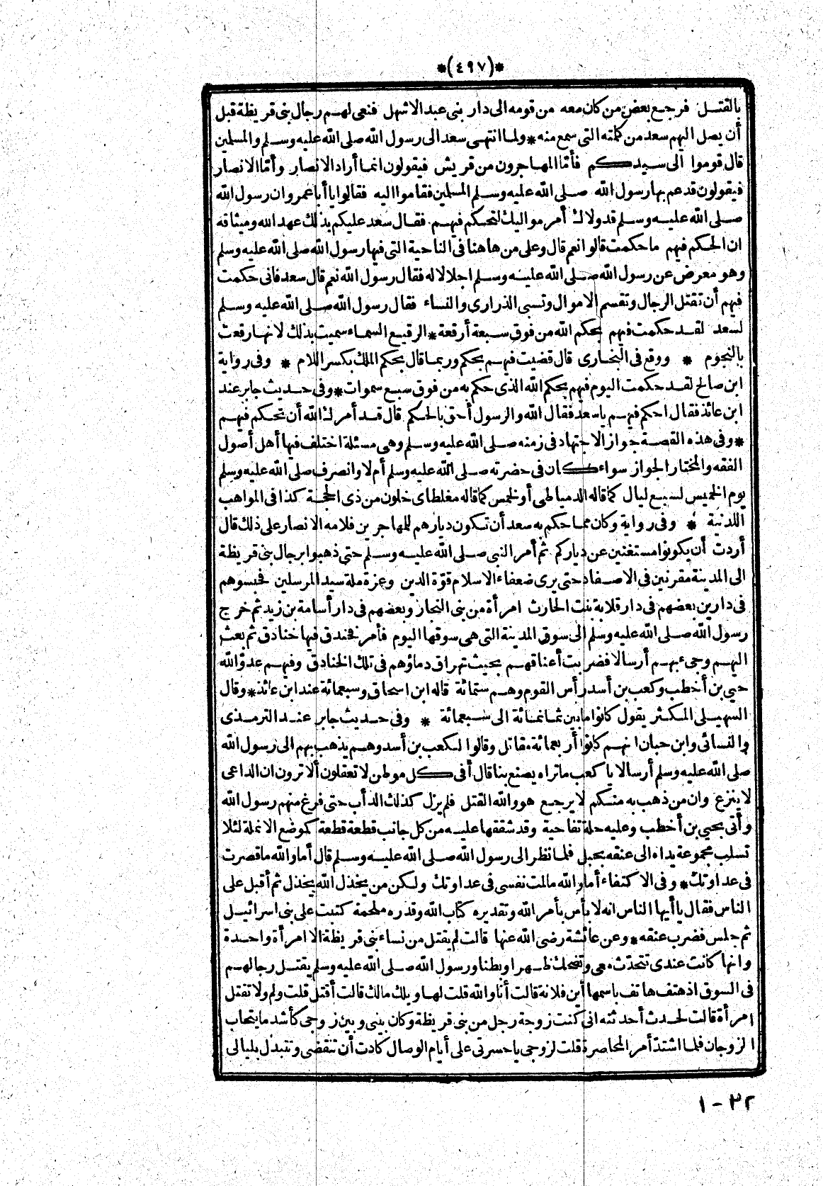 بالقتل فرجع بعض من كان معه من قومه الى دار بنى عبد الاشهل فنعى لهم رجال بنى قريظة قبل أن يصل اليهم سعد من كلمته التى سمع منه* ولما انتهى سعد الى رسول الله صلّى الله عليه وسلم والمسلمين قال قوموا الى سيدكم فأمّا المهاجرون من قريش فيقولون انما أراد الانصار وأمّا الانصار فيقولون قد عم بها رسول الله صلّى الله عليه وسلم المسلمين فقالوا اليه فقالوا يا أبا عمرو ان رسول الله صلى الله عليه وسلم قد ولاك أمر مواليك لتحكم فيهم فقال سعد عليكم بذلك عهد الله وميثاقه ان الحكم فيهم ما حكمت قالوا نعم قال وعلى من هاهنا فى الناحية التى فيها رسول الله صلّى الله عليه وسلم وهو معرض عن رسول الله صلّى الله عليه وسلم اجلالا له فقال رسول الله نعم قال سعد فانى حكمت فيهم أن تقتل الرجال وتقسم الاموال وتسبى الذرارى والنساء فقال رسول الله صلّى الله عليه وسلم لسعد لقد حكمت فيهم بحكم الله من فوق سبعة أرقعة* الرقيع السماء سميت بذلك لانها رقعت بالنجوم* ووقع فى البخارى قال قضيت فيهم بحكم وربما قال بحكم الملك بكسر اللام* وفى رواية ابن صالح لقد حكمت اليوم فيهم بحكم الله الذى حكم به من فوق سبع سموات* وفى حديث جابر عند ابن عائذ فقال احكم فيهم يا سعد فقال الله والرسول أحق بالحكم قال قد أمرك الله أن تحكم فيهم* وفى هذه القصة جواز الاجتهاد فى زمنه صلّى الله عليه وسلم وهى مسئلة اختلف فيها أهل أصول الفقه والمختار الجواز سواء كان فى حضرته صلّى الله عليه وسلم أم لا وانصرف صلّى الله عليه وسلم يوم الخميس لسبع ليال كما قاله الدمياطى أو لخمس كما قاله مغلطاى خلون من ذى الحجة كذا فى المواهب اللدنية* وفى رواية وكان مما حكم به سعد أن تكون ديارهم للمهاجرين فلامه الانصار على ذلك قال أردت أن يكونوا مستغنين عن دياركم ثم أمر النبى صلّى الله عليه وسلم حتى ذهبوا برجال بنى قريظة الى المدينة مقرنين فى الاصفاد حتى يرى ضعفاء الاسلام قوّة الدين وعزة ملة سيد المرسلين فحبسوهم فى دارين بعضهم فى دار قلابة بنت الحارث امرأة من بنى النجار وبعضهم فى دار أسامة بن زيد ثم خرج رسول الله صلّى الله عليه وسلم الى سوق المدينة التى هى سوقها اليوم فأمر فخندق فيها خنادق ثم بعث اليهم وجىء بهم أرسالا فضربت أعناقهم بحيث تهراق دماؤهم فى تلك الخنادق وفيهم عدوّ الله حيى بن أخطب وكعب بن أسد رأس القوم وهم ستمائة قاله ابن اسحاق وسبعمائة عند ابن عائذ* وقال السهيلى المكثر يقول كانوا ما بين ثمانمائة الى سبعمائة* وفى حديث جابر عند الترمذى والنسائى وابن حبان انهم كانوا أربعمائة مقاتل وقالوا لكعب بن أسدوهم يذهب بهم الى رسول الله صلى الله عليه وسلم أرسالا يا كعب ما تراه يصنع بنا قال أفى كل موطن لا تعقلون ألا ترون ان الداعى لا ينزع وان من ذهب به منكم لا يرجع هو والله القتل فلم يزل كذلك الدأب حتى فرغ منهم رسول الله وأتى بحيى بن أخطب وعليه حلة تفاحية وقد شققها عليه من كل جانب قطعة قطعة كموضع الانملة لئلا تسلب مجموعة يداه الى عنقه بحبل فلما نظر الى رسول الله صلّى الله عليه وسلم قال أما والله ما قصرت فى عداوتك* وفى الاكتفاء أما والله ما لمت نفسى فى عداوتك ولكن من يخذل الله يخذل ثم أقبل على الناس فقال يا أيها الناس انه لا بأس بأمر الله وتقديره كتاب الله وقدره ملحمة كتبت على بنى اسرائيل ثم جلس فضرب عنقه* وعن عائشة رضى الله عنها قالت لم يقتل من نساء بنى قريظة الا امرأة واحدة وانها كانت عندى تتحدّث معى وتضحك ظهرا وبطنا ورسول الله صلّى الله عليه وسلم يقتل رجالهم فى السوق اذ هتف هاتف باسمها اين فلانة قالت أنا والله قلت لها ويلك مالك قالت أقتل قلت ولم ولا تقتل امرأة قالت لحدث أحدثته انى كنت زوجة رجل من بنى قريظة وكان بينى وبين زوجى كأشد ما يتحاب الزوجان فلما اشتدّ أمر المحاصرة قلت لزوجى يا حسرتى على أيام الوصال كادت أن تنقضى وتتبدل
