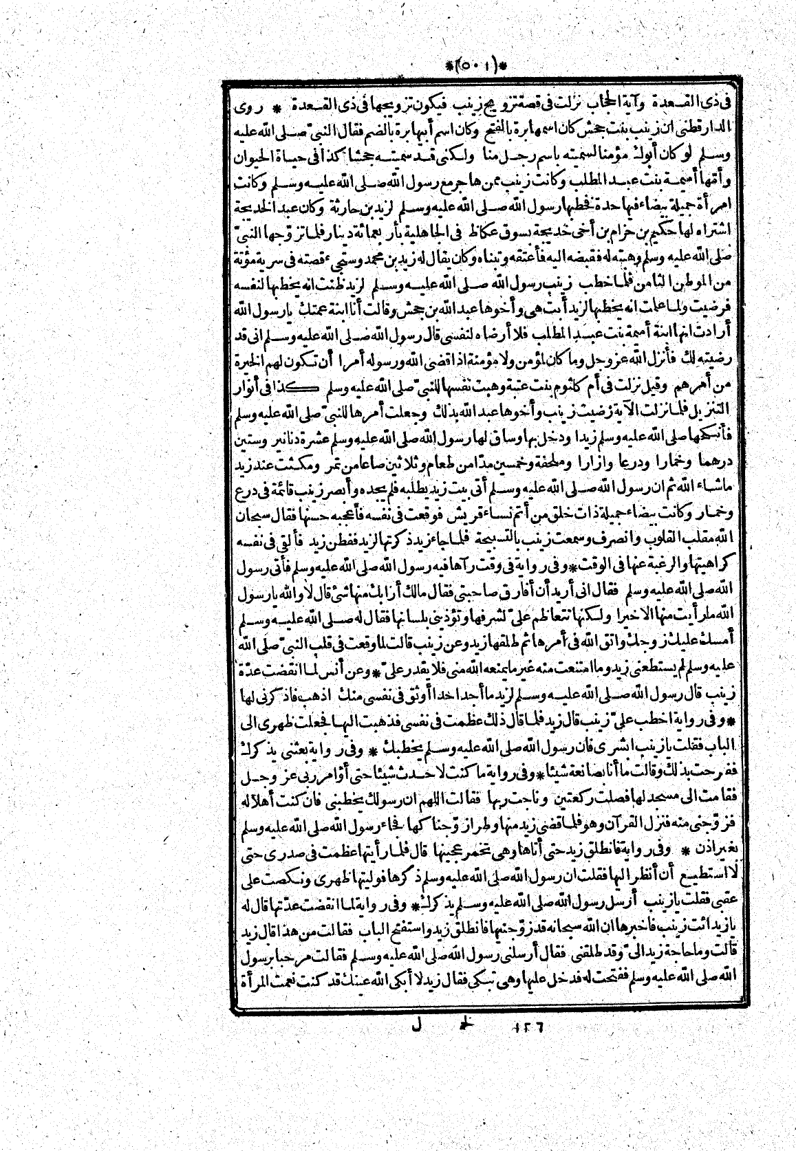 فى ذى القعدة وآية الحجاب نزلت فى قصة تزويج زينب فيكون تزويجها فى ذى القعدة* روى الدار قطنى ان زينب جحش كان اسمها برة بالفتح وكان اسم أبيها برة بالضم فقال النبىّ صلّى الله عليه وسلم لو كان أبوك مؤمنا لسميته باسم رجل منا ولكنى قد سميته جحشا كذا فى حياة الحيوان وأمّها أميمة بنت عبد المطلب وكانت زينب ممن هاجر مع رسول الله صلّى الله عليه وسلم وكانت امرأة جميلة بيضاء فيها حدة فخطبها رسول الله صلّى الله عليه وسلم لزيد بن حارثة وكان عبد الخديجة اشتراه لها حكيم بن حزام بن أخى خديجة بسوق عكاظ فى الجاهلية بأربعمائة دينار فلما تزوّجها النبىّ صلى الله عليه وسلم وهبته له فقبضه اليه فأعتقه وتبناه وكان يقال له زيد بن محمد وستجىء قصته فى سرية مؤتة من الموطن الثامن فلما خطب زينب رسول الله صلّى الله عليه وسلم لزيد ظنت انه يخطبها لنفسه فرضيت ولما علمت انه يخطبها لزيد أبت هى وأخوها عبد الله بن جحش وقالت أنا ابنة عمتك يا رسول الله أرادت انها ابنة أميمة بنت عبد المطلب فلا أرضاه لنفسى قال رسول الله صلّى الله عليه وسلم انى قد رضيته لك فأنزل الله عز وجل وما كان لمؤمن ولا مؤمنة اذا قضى الله ورسوله أمرا أن تكون لهم الخيرة من أمرهم وقيل نزلت فى أم كلثوم بنت عتبة وهبت نفسها للنبىّ صلّى الله عليه وسلم كذا فى أنوار التنزيل فلما نزلت الآية زضيت زينب وأخوها عبد الله بذلك وجعلت أمرها للنبىّ صلّى الله عليه وسلم فأنكحها صلّى الله عليه وسلم زيدا ودخل بها وساق لها رسول الله صلّى الله عليه وسلم عشرة دنانير وستين درهما وخمارا ودرعا وازارا وملحفة وخمسين مدّا من طعام وثلاثين صاعا من تمر ومكثت عند زيد ما شاء الله ثم ان رسول الله صلّى الله عليه وسلم أتى بيت زيد يطلبه فلم يجده وأبصر زينب قائمة فى درع وخمار وكانت بيضاء جميلة ذات خلق من أتم نساء قريش فوقعت فى نفسه فأعجبه حسنها فقال سبحان الله مقلب القلوب وانصرف وسمعت زينب بالتسبيحة فلما جاء زيد ذكرتها لزيد ففطن زيد فألقى فى نفسه كراهيتها والرغبة عنها فى الوقت* وفى رواية فى وقت رآها فيه رسول الله صلّى الله عليه وسلم فأتى رسول الله صلّى الله عليه وسلم فقال انى أريد أن أفارق صاحبتى فقال مالك أرابك منها شىء قال لا والله يا رسول الله ما رأيت منها الاخيرا ولكنها تتعاظم علىّ لشرفها وتؤذينى بلسانها فقال له صلّى الله عليه وسلم أمسك عليك زوجك واتق الله فى أمرها ثم طلقها زيد وعن زينب قالت لما وقعت فى قلب النبىّ صلّى الله عليه وسلم لم يستطعنى زيد وما امتنعت منه غير ما يمنعه الله منى فلا يقدر علىّ* وعن أنس لما انقضت عدّة زينب قال رسول الله صلّى الله عليه وسلم لزيد ما أجد احدا أوثق فى نفسى منك اذهب فاذكرنى لها* وفى رواية اخطب علىّ زينب قال زيد فلما قال ذلك عظمت فى نفسى فذهبت اليها فجعلت ظهرى الى الباب فقلت يا زينب ابشرى فان رسول الله صلّى الله عليه وسلم يخطبك* وفى رواية بعثنى يذكرك ففرحت بذلك وقالت ما أنا بصانعة شيئا* وفى رواية ما كنت لاحدث شيئا حتى أؤامر ربى عز وجل فقامت الى مسجد لها فصلت ركعتين وناجت ربها فقالت اللهم ان رسولك يخطبنى فان كنت أهلا له فزوّجنى منه فنزل القرآن وهو فلما قضى زيد منها وطرا زوّجناكها فجاء رسول الله صلّى الله عليه وسلم بغير اذن* وفى رواية فانطلق زيد حتى أتاها وهى تخمر عجينها قال فلما رأيتها عظمت فى صدرى حتى لا استطيع أن أنظر اليها فقلت ان رسول الله صلّى الله عليه وسلم ذكرها فوليتها ظهرى ونكصت على عقبى فقلت يا زينب أرسل رسول الله صلّى الله عليه وسلم يذكرك* وفى رواية لما انقضت عدّتها قال له يا زيد ائت زينب فاخبرها ان الله سبحانه قد زوّجنيها فانطلق زيد واستفتح الباب فقالت من هذا قال زيد قالت وما حاجة زيد الىّ وقد طلقنى فقال أرسلنى رسول الله صلّى الله عليه
