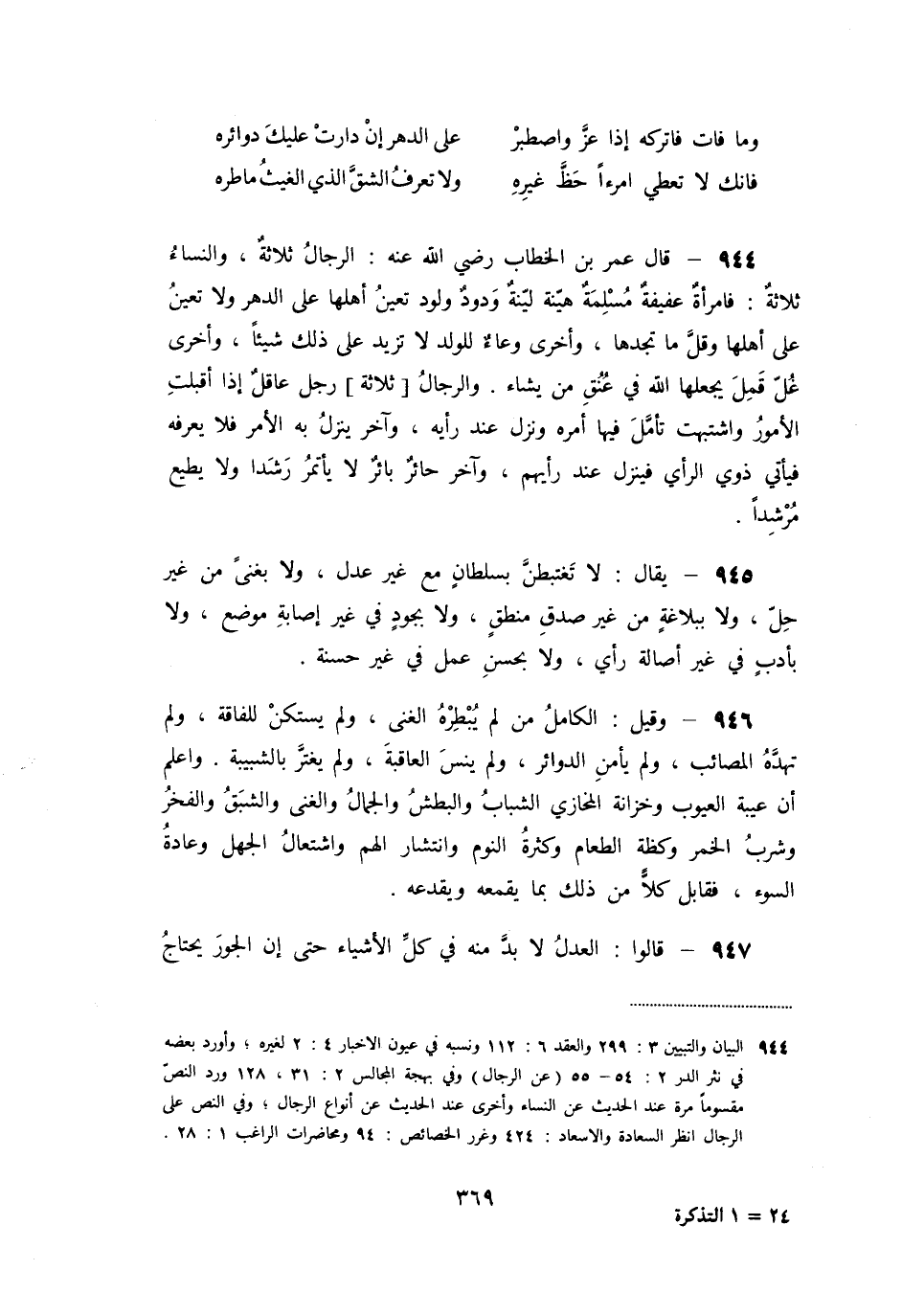 [944] البيان والتبيين 3: 299 والعقد 6: 112 ونسبه في عيون الاخبار 4: 2 لغيره؛ وأورد بعضه في نثر الدر 2: 54- 55 (عن الرجال) وفي بهجة المجالس 2: 31، 128 ورد النصّ مقسوما مرة عند الحديث عن النساء وأخرى عند الحديث عن أنواع الرجال؛ وفي النص على الرجال انظر السعادة والاسعاد: 424 وغرر الخصائص: 94 ومحاضرات الراغب 1: 28.