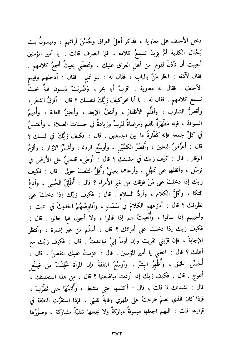 فقال لآذنه: انظر من بالباب، فقال له: بنو تميم. فقال: أدخلهم وفيهم الأحنف. فقال له معاوية: اقرب أبا بحر، وضربت لميسون قبة بحيث تسمع كلامهم. فقال له: يا أبا بحر كيف زيّك لنفسك؟ قال: أفرق الشعر؛ وأقصّ الشارب، وأقلّم الأظفار، وأنتف الإبط، وأحلق العانة، وأديم السواك، فإنه مطهرة للفم ومرضاة للربّ وزيادة في حسنات الصلاة، وأغتسل في كلّ جمعة فإنه كفّارة ما بين الجمعتين. قال: فكيف زيّك في لبسك؟