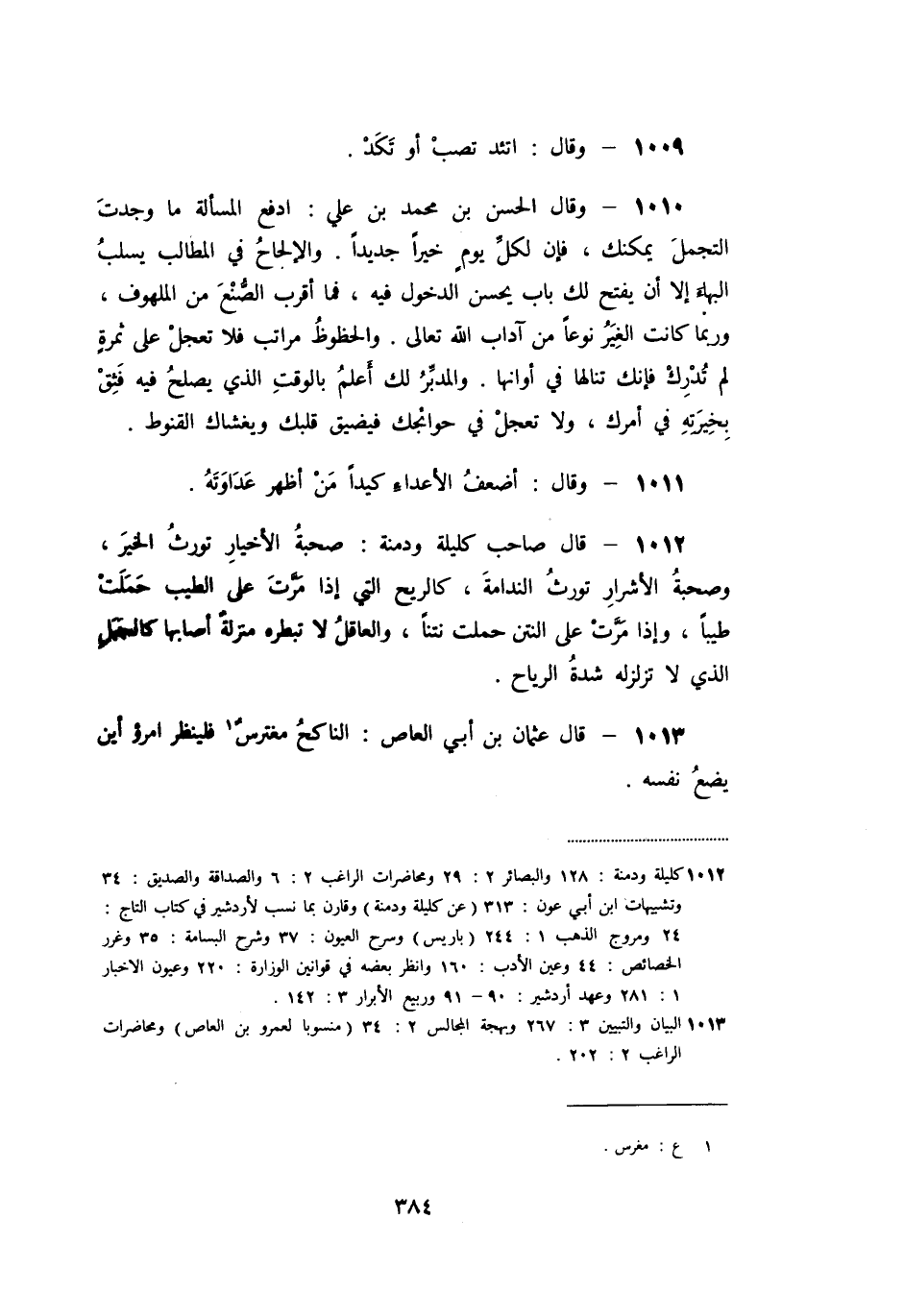 [1012] كليلة ودمنة: 128 والبصائر 2: 29 ومحاضرات الراغب 2: 6 والصداقة والصديق: 34 وتشبيهات ابن أبي عون: 313 (عن كليلة ودمنة) وقارن بما نسب لأردشير في كتاب التاج: