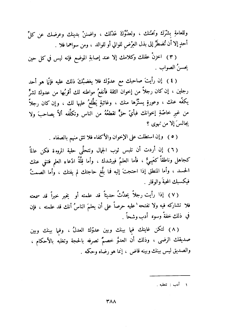 (8) لتكن غايتك فيما بينك وبين عدوّك العدل، وفيما بينك وبين صديقك الرضى، وذلك أن العدوّ خصم تصرفه بالحجة وتغلبه بالأحكام، والصديق ليس بينك وبينه قاض، إنما هو رضاه وحكمه.