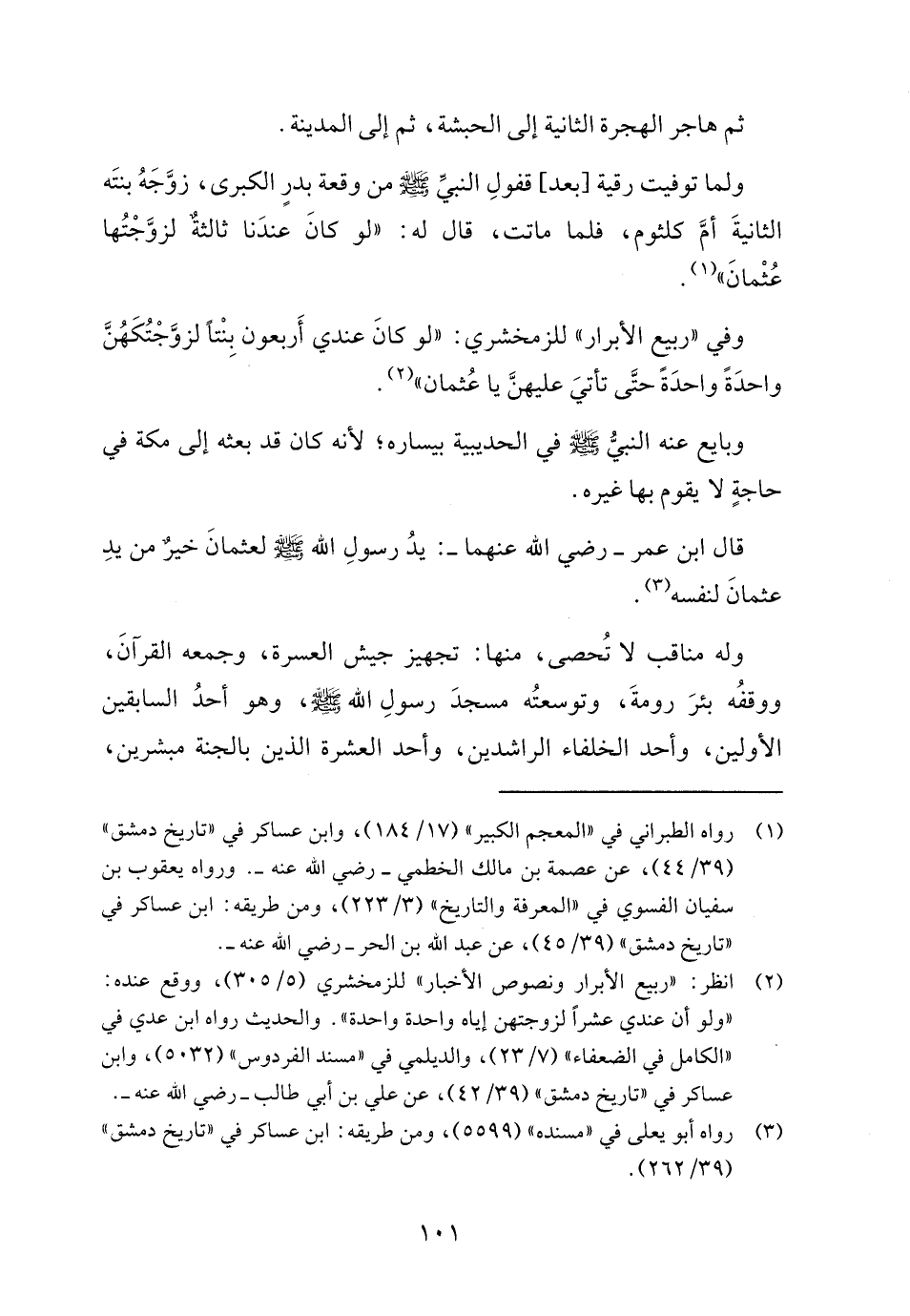 ولما توفيت رقية [بعد] قفولِ النبيِّ - صلى الله عليه وسلم - من وقعة بدرٍ الكبرى، زوَّجَهُ بنتَه الثانيةَ أمَّ كلثوم، فلما ماتت، قال له: "لو كانَ عندَنا ثالثةٌ لزوَّجْتُها عُثْمانَ" (١).