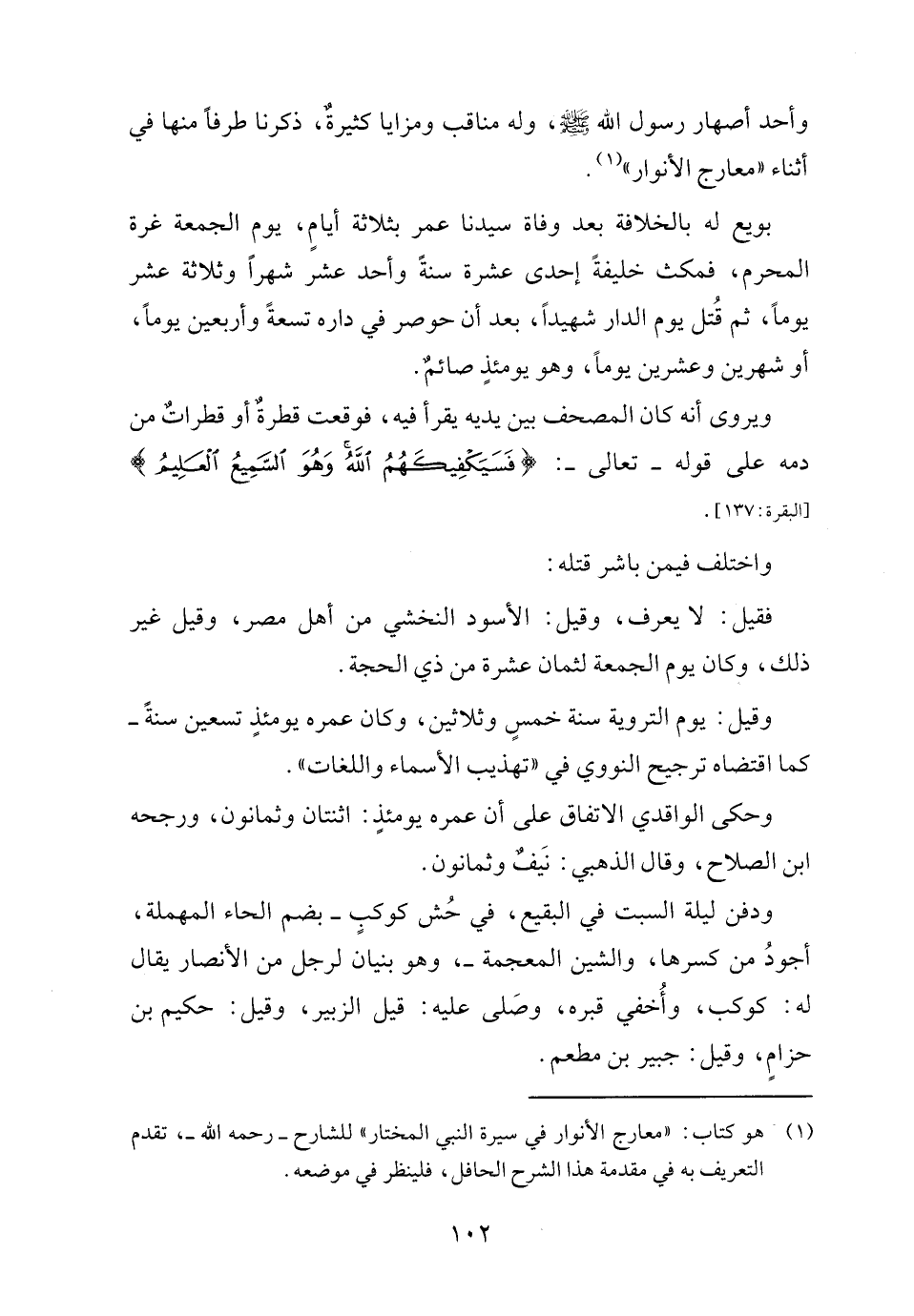 وأحد أصهار رسول الله - صلى الله عليه وسلم -، وله مناقب ومزايا كثيرةٌ، ذكرنا طرفاً منها في أثناء "معارج الأنوار" (١).