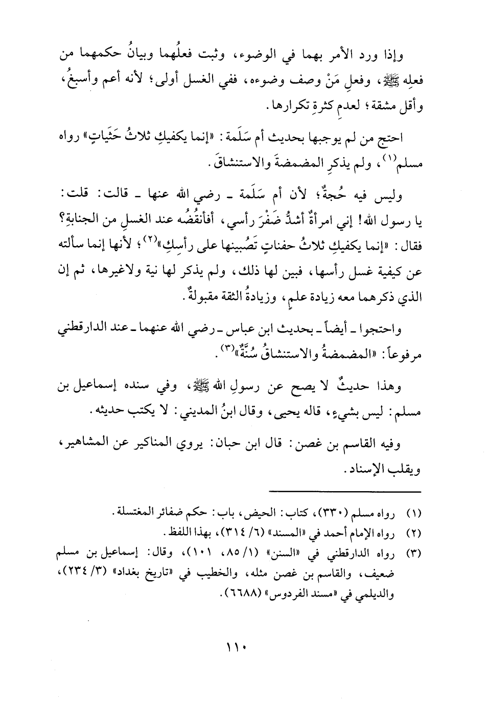 وليس فيه حُجةٌ؛ لأن أم سَلَمة - رضي الله عنها - قالت: قلت: يا رسول الله! إني امرأةٌ أشدُّ ضَفْرَ رأسي، أفأنقُضُه عند الغسلِ من الجنابةِ؟ فقال: "إنما يكفيكِ ثلاثُ حفناتٍ تَصُبينها على رأسِكِ" (٢)؛ لأنها إنما سألته عن كيفية غسل رأسها، فبين لها ذلك، ولم يذكر لها نية ولا غيرها، ثم إن الذي ذكرهما معه زيادة علمٍ، وزيادةُ الثقة مقبولةٌ.