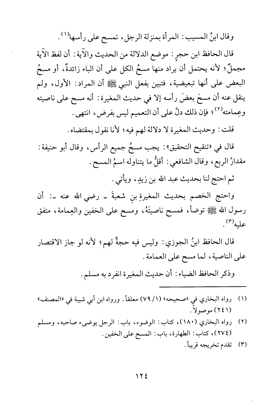 واحتج الخصم بحديث المغيرةِ بنِ شعبةَ - رضي الله عنه -: أن رسول الله - صلى الله عليه وسلم - توضأ، فمسح ناصيتَهُ، ومسح على الخفين والعِمامة، متفق عليه (٣).