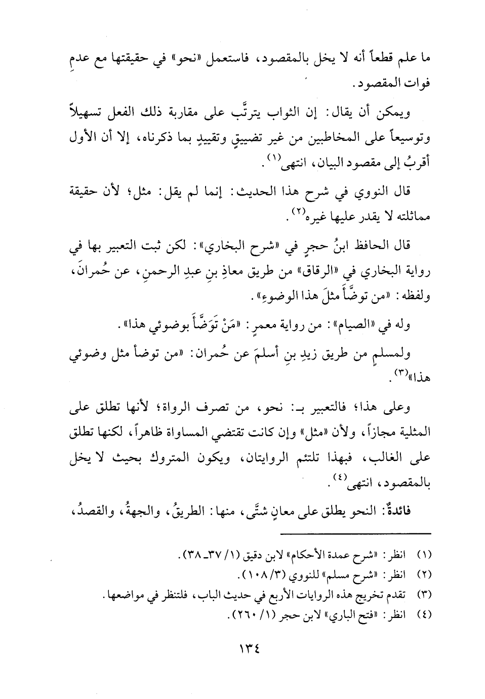 وعلى هذا، فالتعبير بـ: نحو، من تصرف الرواة؛ لأنها تطلق على المثلية مجازاً، ولأن "مثل" وإن كانت تقتضي المساواة ظاهراً، لكنها تطلق على الغالب، فبهذا تلتئم الروايتان، ويكون المتروك بحيث لا يخل بالمقصود، انتهى (٤).