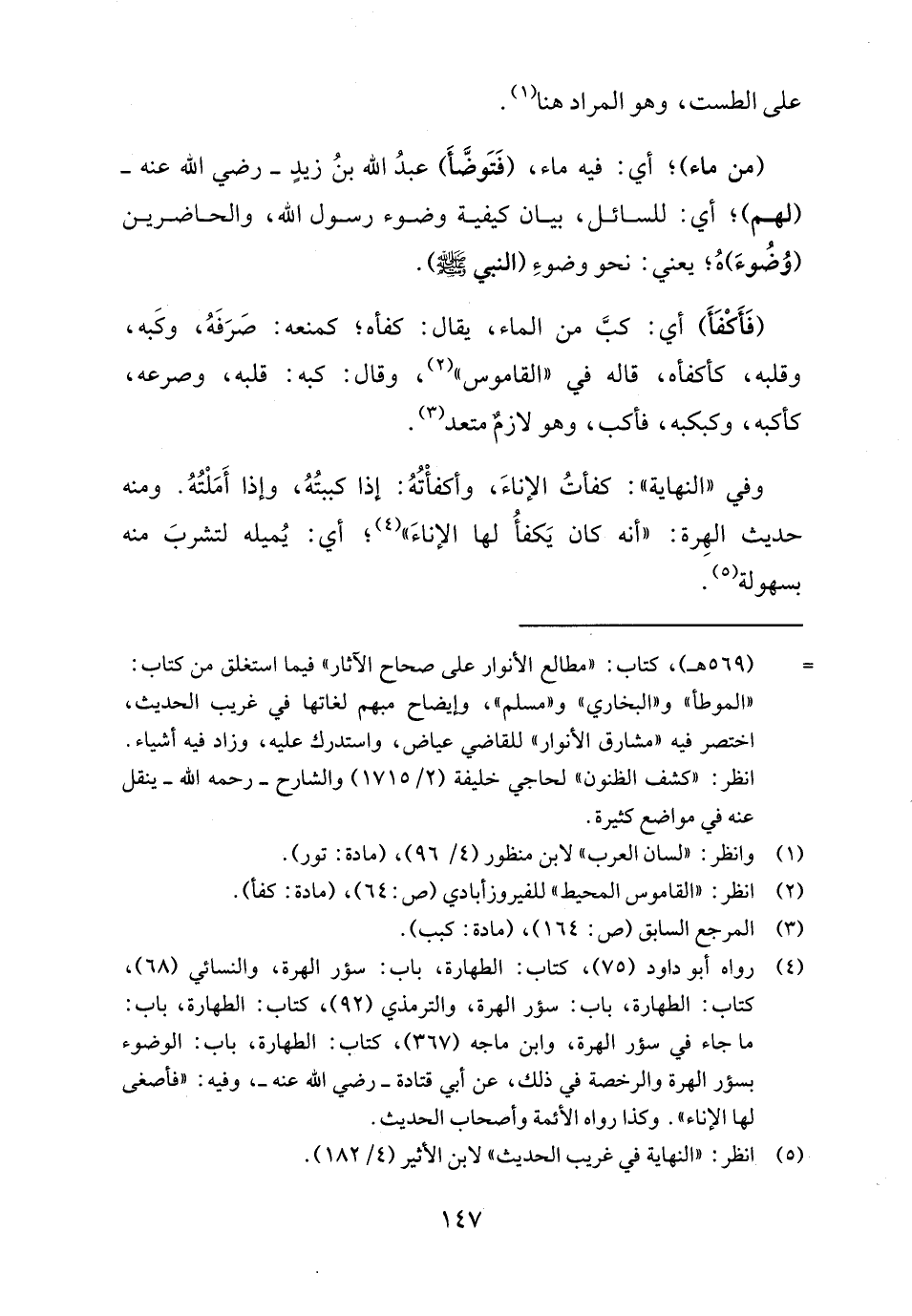 (فَأَكْفَأَ) أي: كبَّ من الماء، يقال: كفأه؛ كمنعه: صَرَفَهُ، وكَبه، وقلبه، كأكفأه، قاله في "القاموس" (٢)، وقال: كبه: قلبه، وصرعه، كأكبه، وكبكبه، فأكب، وهو لازمٌ متعد (٣).