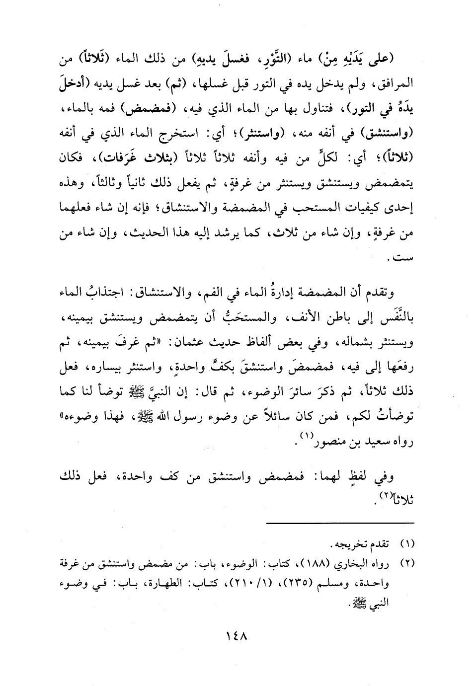 (٢) رواه البخاري (١٨٨)، كتاب: الوضوء، باب: من مضمض واستنشق من غرفة واحدة، ومسلم (٢٣٥)، (١/ ٢١٠)، كتاب: الطهارة، باب: في وضوء النبي - صلى الله عليه وسلم -.