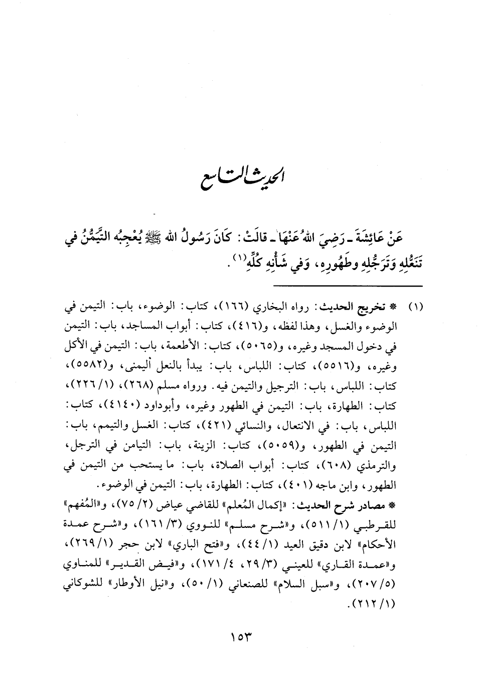 عَنْ عَائِشَةَ - رَضِيَ اللهُ عَنْهَا - قالَتْ: كَانَ رَسُولُ الله - صلى الله عليه وسلم - يُعْجِبُه التَّيَمُّنُ في تَنَعُّلِهِ وَتَرَجُّلِهِ وطَهُورِهِ، وَفي شَأْنِهِ كلِّهِ (١).
