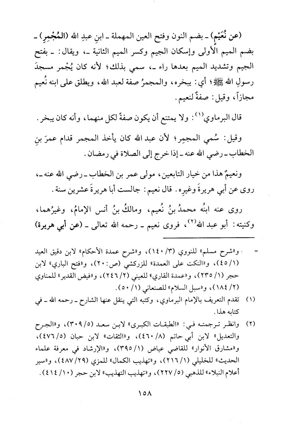ونعيمٌ هذا من خيار التابعين، مولى عمر بن الخطاب - رضي الله عنه -، روى عن أبي هريرةَ وغيرِه. قال نعيم: جالست أبا هريرةَ عشرين سنة.