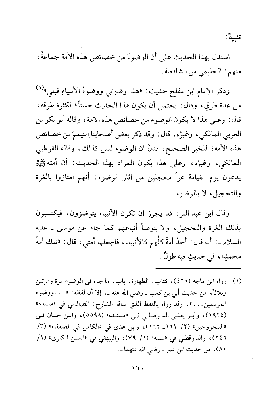 وذكر الإمام ابن مفلح حديث: "هذا وضوئي ووضوءُ الأنبياءِ قبلي" (١) من عدة طرقٍ، وقال: يحتمل أن يكون هذا الحديث حسناً؛ لكثرة طرقه، قال: وعلى هذا لا يكون الوضوء من خصائص هذه الأمة، وقاله أبو بكر بن العربي المالكي، وغيرُه، قال: وقد ذكر بعض أصحابنا التيممَ من خصائص هذه الأمة؛ للخبر الصحيح، فدلَّ أن الوضوء ليس كذلك، وقاله القرطبي المالكي، وغيرُه، وعلى هذا يكون المراد بهذا الحديث: أن أمته - صلى الله عليه وسلم - يدعون يوم القيامة غراً محجلين من آثار الوضوء: أنهم امتازوا بالغرة والتحجيل، لا بالوضوء.