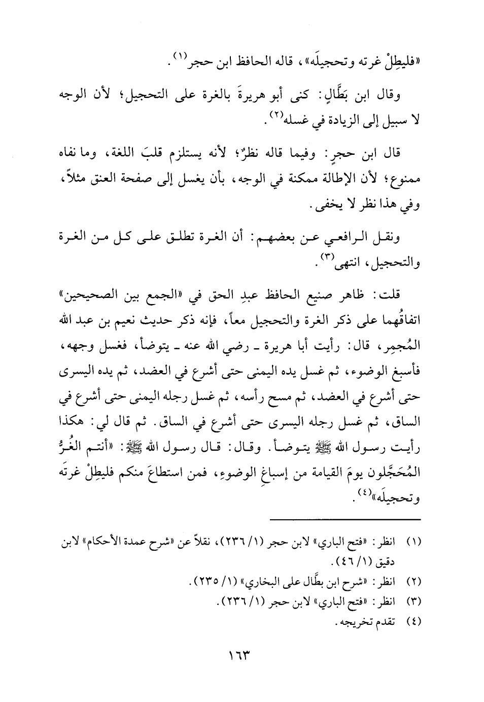 قلت: ظاهر صنيع الحافظ عبدِ الحق في "الجمع بين الصحيحين" اتفاقُهما على ذكر الغرة والتحجيل معاً، فإنه ذكر حديث نعيم بن عبد الله المُجمِر، قال: رأيت أبا هريرة - رضي الله عنه - يتوضأ، فغسل وجهه، فأسبغ الوضوء، ثم غسل يده اليمنى حتى أشرع في العضد، ثم يده اليسرى حتى أشرع في العضد، ثم مسح رأسه، ثم غسل رجله اليمنى حتى أشرع في الساق، ثم غسل رجله اليسرى حتى أشرع في الساق. ثم قال لي: هكذا رأيت رسول الله - صلى الله عليه وسلم - يتوضأ. وقال: قال رسول الله - صلى الله عليه وسلم -: "أنتم الغُرُّ المُحَجَّلون يومَ القيامة من إسباغِ الوضوءِ، فمن استطاعَ منكم فليطِلْ غرتَه وتحجيلَه" (٤).