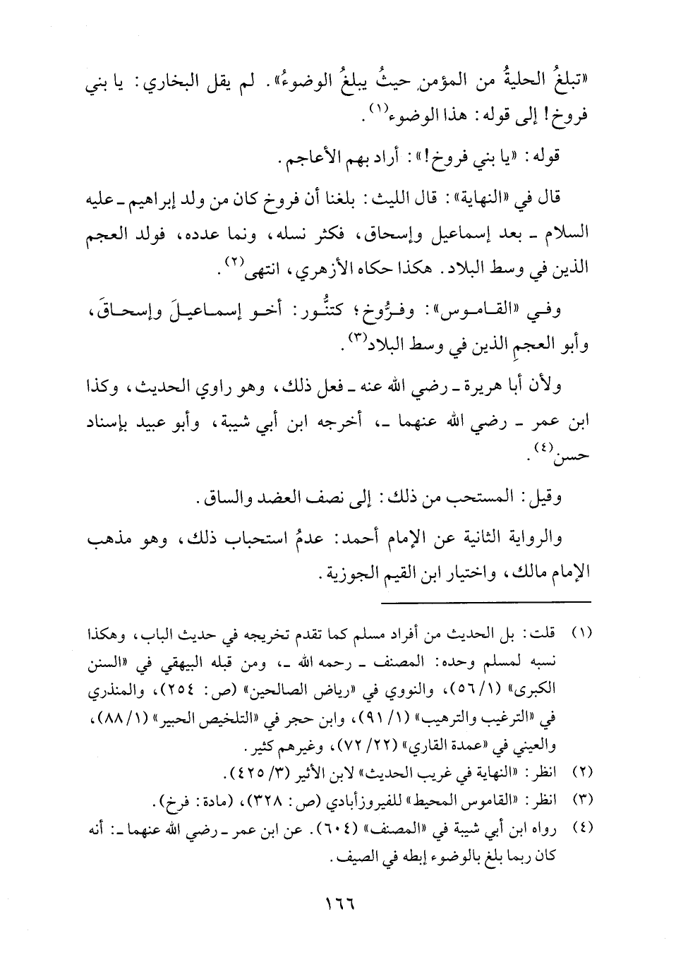 "تبلغُ الحليةُ من المؤمن حيثُ يبلغُ الوضوءُ". لم يقل البخاري: يا بني فروخ! إلى قوله: هذا الوضوء (١).