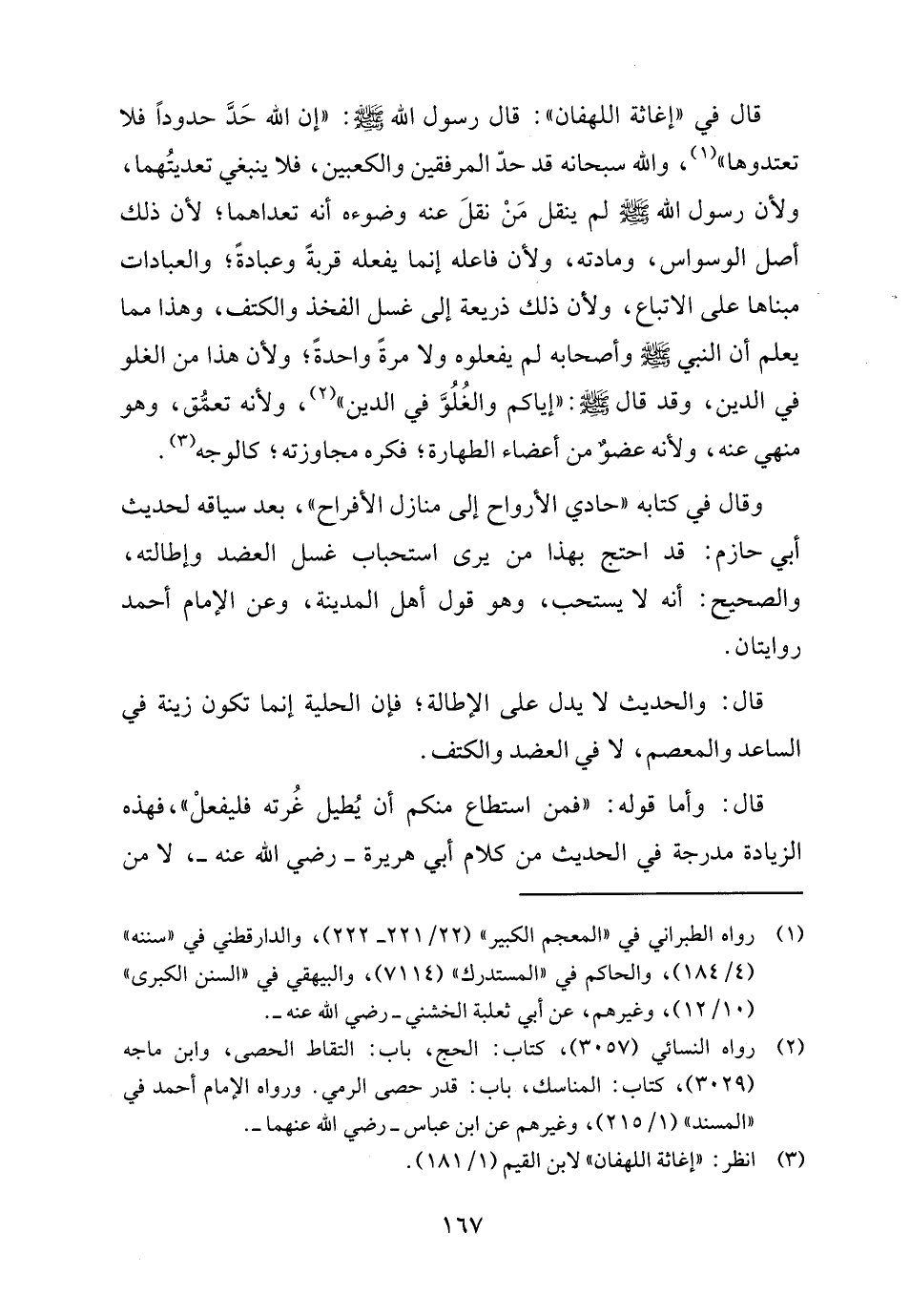 وقال في كتابه "حادي الأرواح إلى منازل الأفراح"، بعد سياقه لحديث أبي حازم: قد احتج بهذا من يرى استحباب غسل العضد وإطالته، والصحيح: أنه لا يستحب، وهو قول أهل المدينة، وعن الإمام أحمد روايتان.