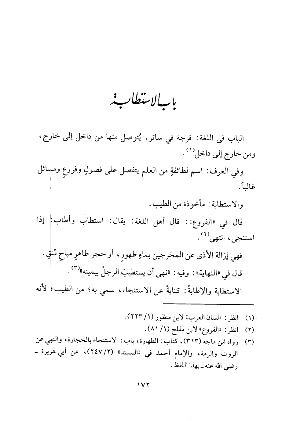 (٣) رواه ابن ماجه (٣١٣)، كتاب: الطهارة، باب: الاستنجاء بالحجارة، والنهي عن الروث والرمة، والإمام أحمد في "المسند" (٢/ ٢٤٧)، عن أبي هريرة - رضي الله عنه - بهذا اللفظ.