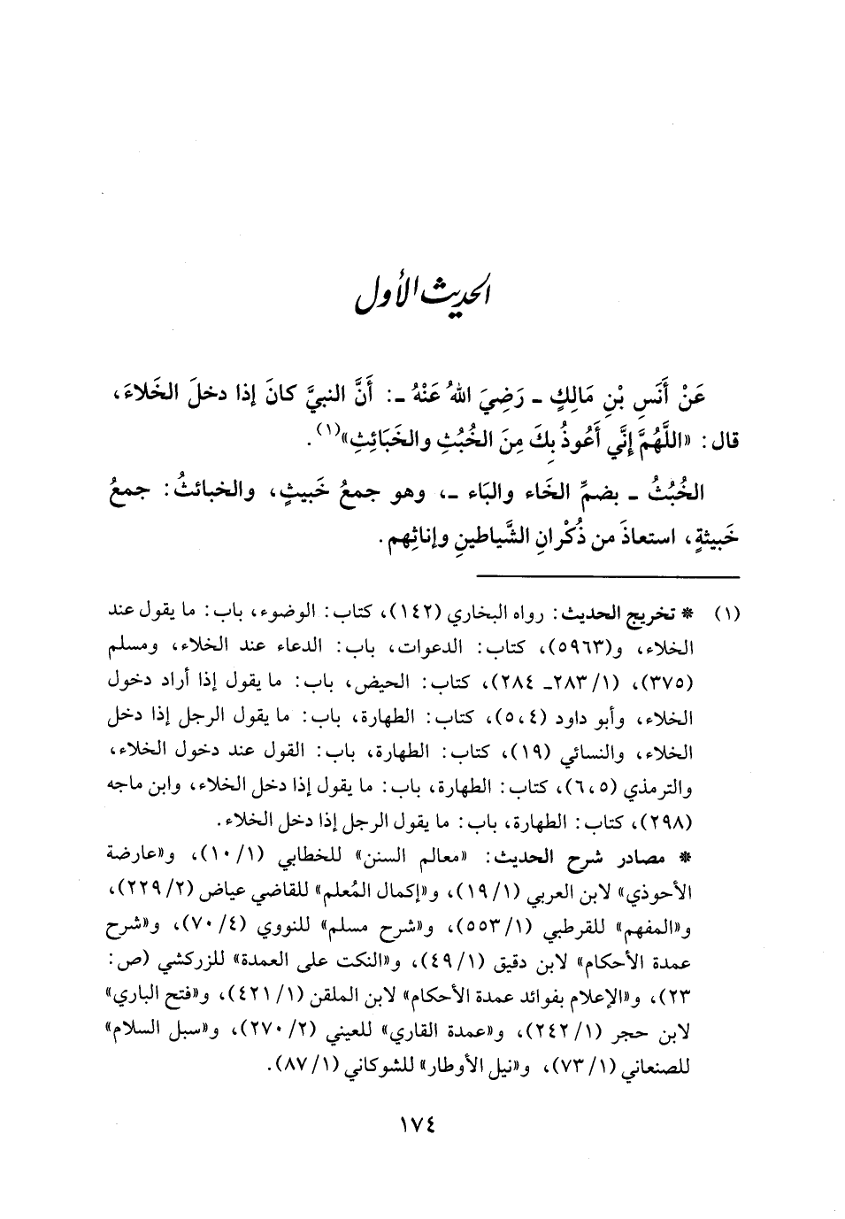 عَنْ أَنَسِ بْنِ مَالِكٍ - رَضِيَ اللهُ عَنْهُ -: أَنَّ النبيَّ كانَ إذا دخلَ الخَلاءَ، قال: "اللَّهُمَّ إِنَّي أَعُوذُ بِكَ مِنَ الخُبُثِ والخَبَائِثِ" (١).