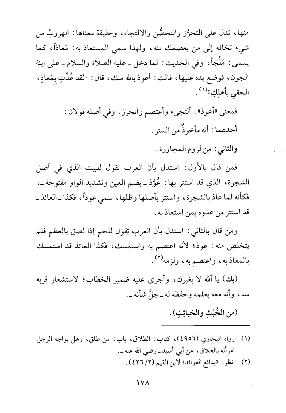 منها، تدل على التحرُّز والتحصُّن والالتجاء، وحقيقة معناها: الهروبُ من شيء تخافه إلى من يعصمك منه، ولهذا سمي المستعاذ به: مَعاذاً، كما يسمى: مَلْجأ، وفي الحديث: لما دخل - عليه الصلاة والسلام - على ابنة الجون، فوضع يده عليها، قالت: أعوذ بالله منك، قال: "لقد عُذْتِ بِمَعاذٍ، الحقي بأهلِكِ" (١).